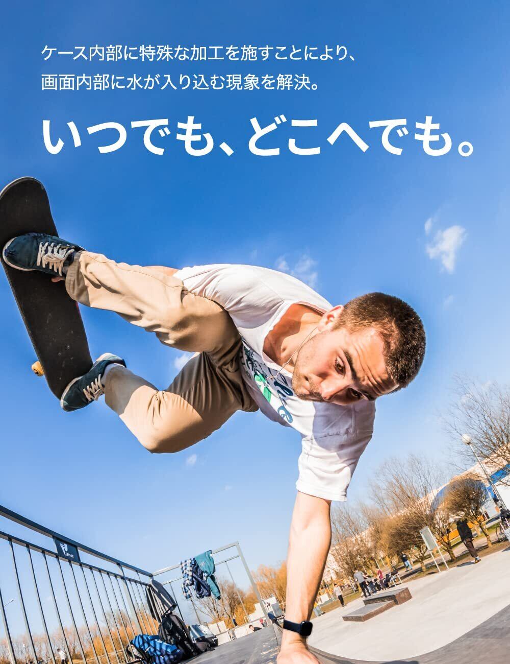 防水仕様 ▏ 特殊加工による防水機能により、手洗い時はもちろんプールでのワークアウトやキャンプなどのアウトドアでも場所を問わずご使用いただけます。※アップルウォッチ本来の防水性能を向上させるものではありません。プールや海などの水場でのご使用時はアップルウォッチの説明に従い、スキューバダイビング、ウォータースキーなど、水圧が高くなったり、所定の水深より深く潜るようなアクティビティはしないでください。想定以上の 水流、水圧や外的衝撃により、カバーのパッキンにズレが生じ、 アップル ウォッチ画面部分と保護ケースガラス面との間に水が入る場合があります。外的衝撃を防ぐため、手首を曲げても当たらない位置に装着してご使用ください。 万が一ケースとアップル ウォッチの間に水が侵入した場合には一旦保護ケースを取り外し、柔らかい布で水を拭き取り完全に乾燥させてからのご使用を推奨しております。また、アップル ウォッチ本体の劣化や耐水性が損なわれる場合 がありますので、真水以外に触れた場合は、きれいな水でケースの汚れを除き、糸くずの出ない布で拭き取ってください。