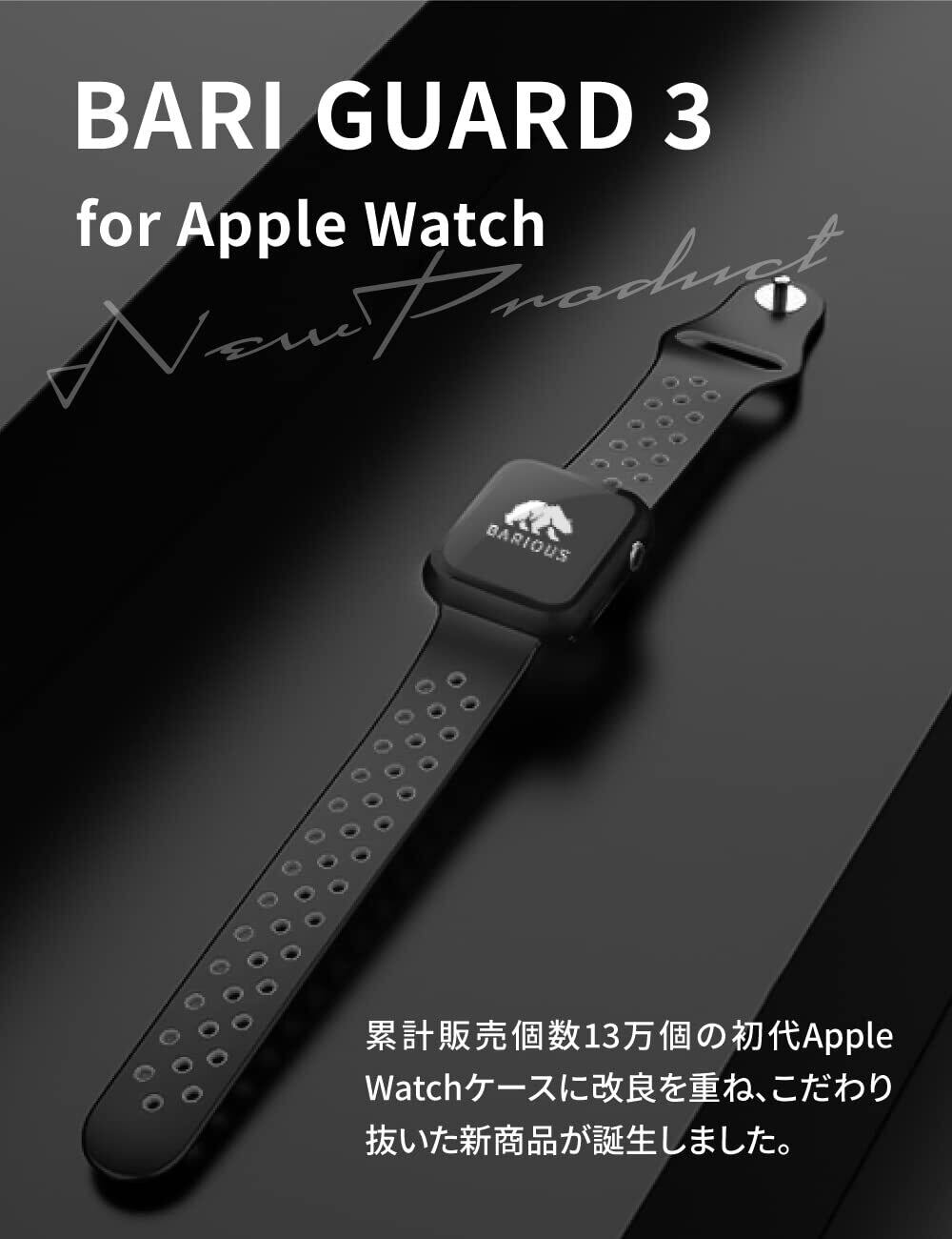 機能性 ▏アップルウォッチの各ボタン操作はアップル ウォッチ本来の操作感に近く、快適に操作できます。バンド部分に干渉しないデザインでバンドの交換もスムーズに。また、アップルウォッチ裏のセンサー部分にカバーがなく、保護ケースを装着したままで充電が可能です。ガラス面には、グレア現象(密着痕)を防止するドット加工を施しております。(100%防ぐものではありません) 腕に着けたまま、かぶせるだけで簡単にカバーを装着できます。従来の保護ケース同様に何度でも着脱可能。カラーはブラック、ホワイトの2色。BARI GUARD3 for Apple Watchの使用過程に何かございましたら、お気軽にご連絡ください。※強化ガラスを使用しておりますが、一点に負荷がかかると破損することがあります。特に脱着時、ガラス面を押さえないようご注意ください。ガラス内側はドット加工が施されている為、摩耗により傷がつく場合があります。香水、溶剤、洗剤、酸や酸性の食品、虫除け、ローション、日焼け止め、油分、毛髪染料などは本製品及びAppleWatchに悪影響を及ぼす可能性がありますので付着しないようにしてください。