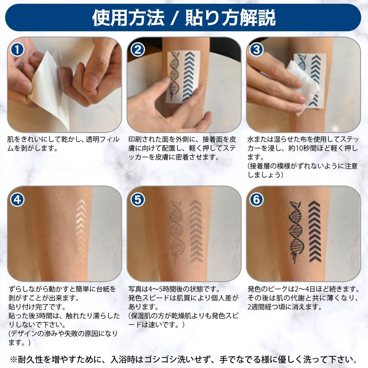 水だけでジャグアタトゥーが出来るシールです。 お得な3デザイン各2枚セットの商品です。 貼付け後、約1~3日でタトゥーの様な色(濃紺)に発色します。 ジャグア果汁が含まれた糊だけのシールで、テカリが少なくリアルな質感を実現。 新陳代謝で自然に消えるまで、約2週間持続します。(個人差あり) 商標取得済み