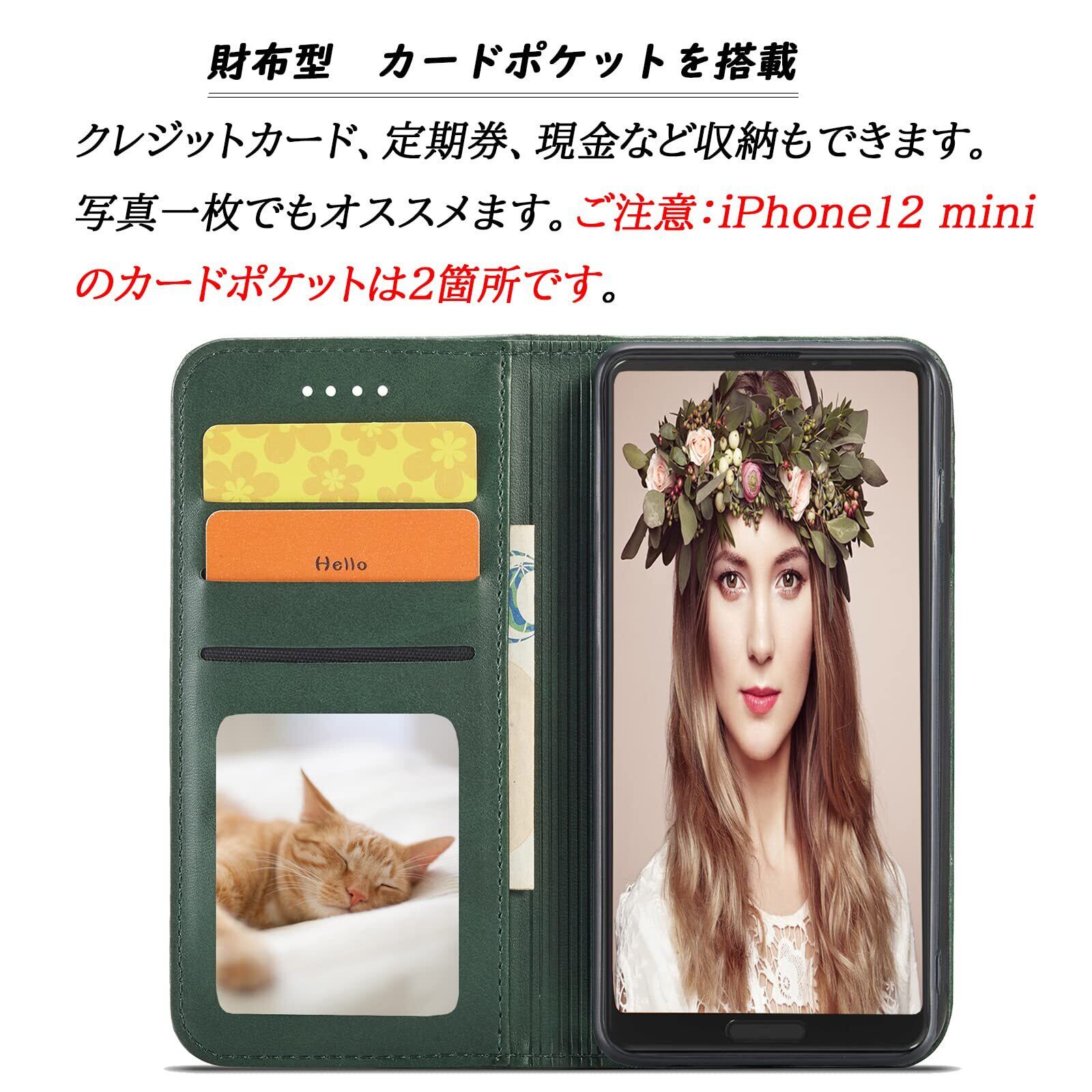 iPhone12 mini 手帳型 iPhone 12 mini 手帳 カバー iPhone12 mini 手帳ケース 携帯ケース iPhone12mini case スマホケース 保護ケース 携帯カバー あいふぉん12手帳型ケース アイフォン12 ミニ ケース 手帳型 PUレザー ストラップホール付き カード収納 内蔵マグネット式 スタンド機能 薄型 防水 ノート型 耐衝撃 男女兼用 落ち着いた色 (iPhone 12 mini 5.4 inch対応) レトログーリン
