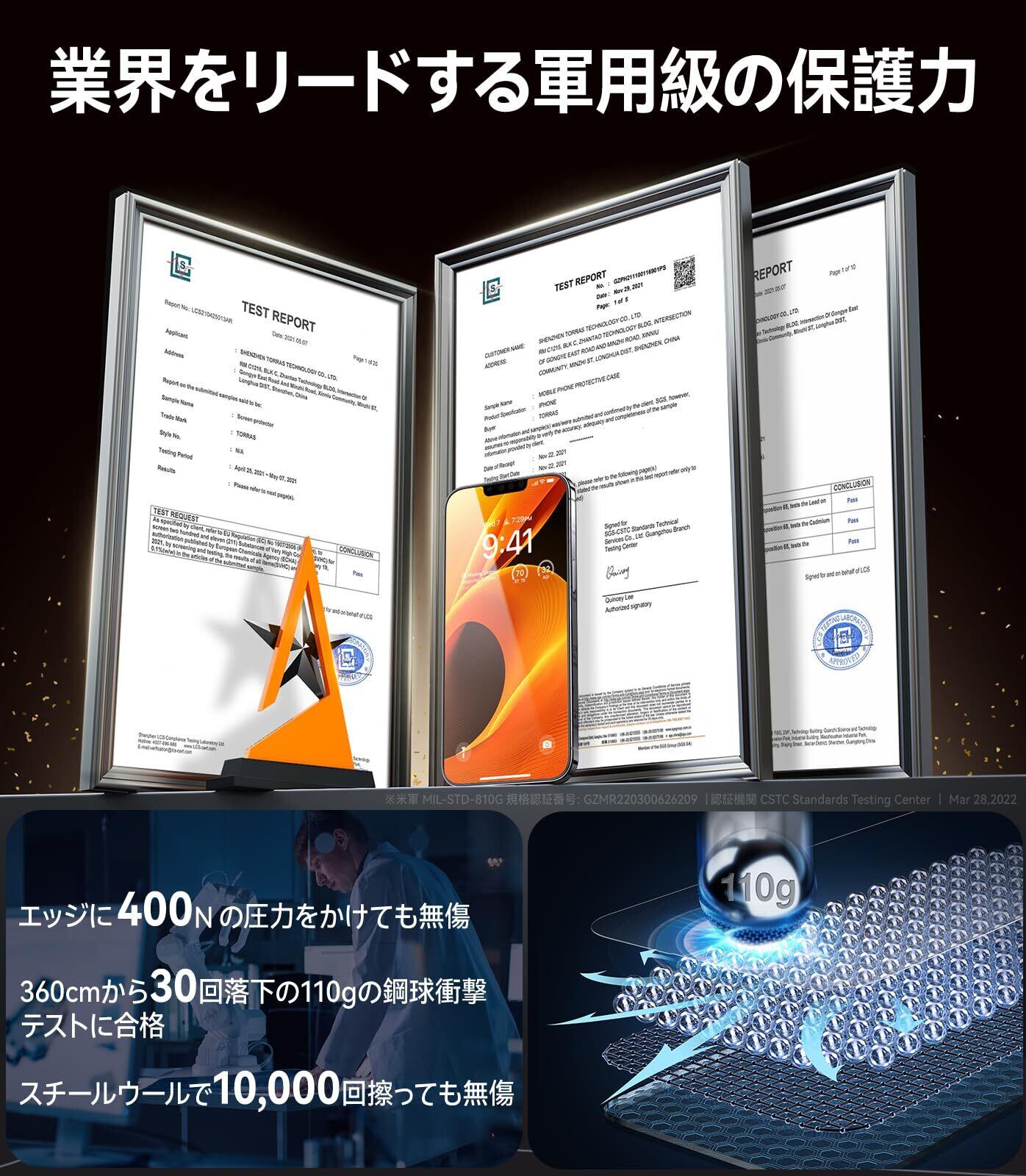 再強化ガラス、硬度9H越え、縁まで全面保護、圧倒的な耐衝撃性、2次除塵、スムースタッチ、撥水、防水、抜群な透明感、強光反射を制御、気泡ゼロ、素人でも簡単に装着できる、目をつぶっても貼れる、気泡レス、光沢…