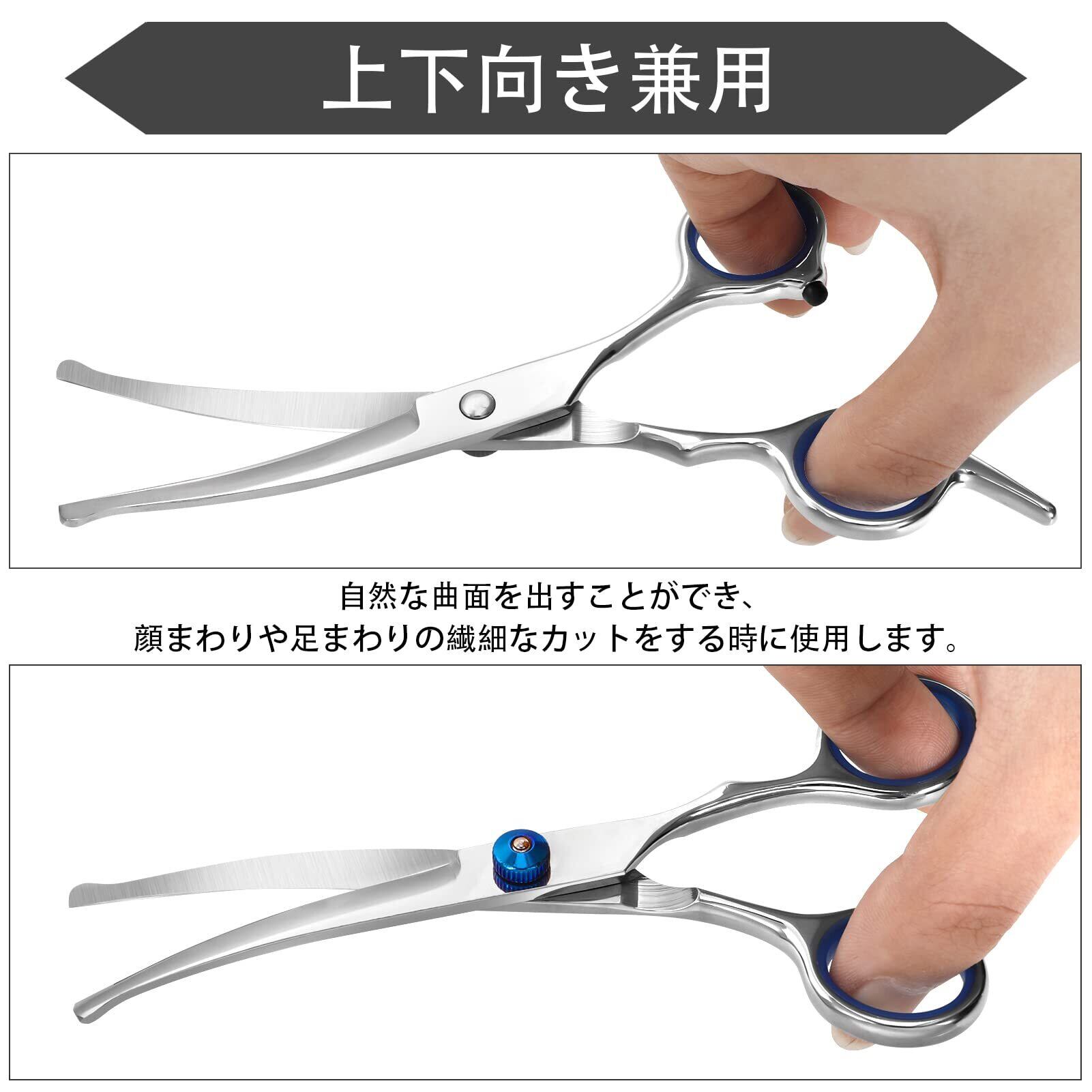 【ペット専用カーブシザー】カーブシザーは、ただ短かくするだけではなく、丸みを帯びたカットなど、トリミングが可能です。ペットはさみの刃先が丸いのでペットを痛めることもありません。刃がカーブしているため、胴体の局面が出しやすくて、顔や足周りなどの細かい作業が簡単にできます