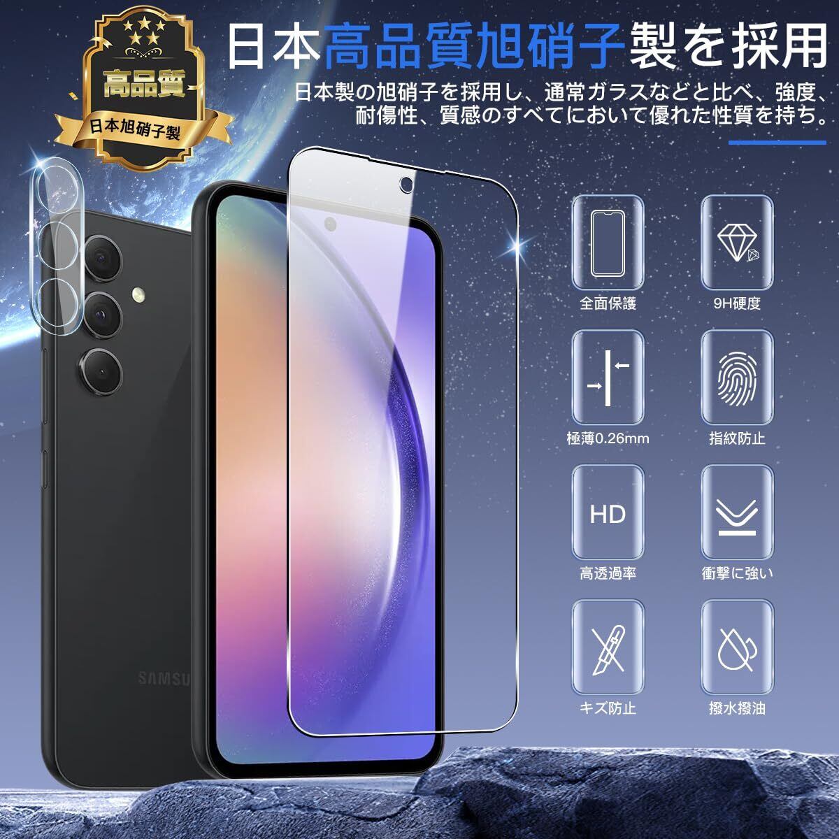 用 Galaxy A54 SC-53D SCG21 ガラスフィルム 2枚+ カメラフィルム 2枚【2+2枚セット 日本旭硝子製 ガイド枠付き】 用 ギャラクシー A54 5G フィルム 液晶保護フィルム 用 Galaxy A54 5G 強化ガラス レンズ保護フィルム ケース カバー 9H硬度 全面保護 耐衝撃 飛散防止 高透過率 超薄型 指紋認証対応 自動吸着 貼り付け簡単 気泡防止 指紋防止