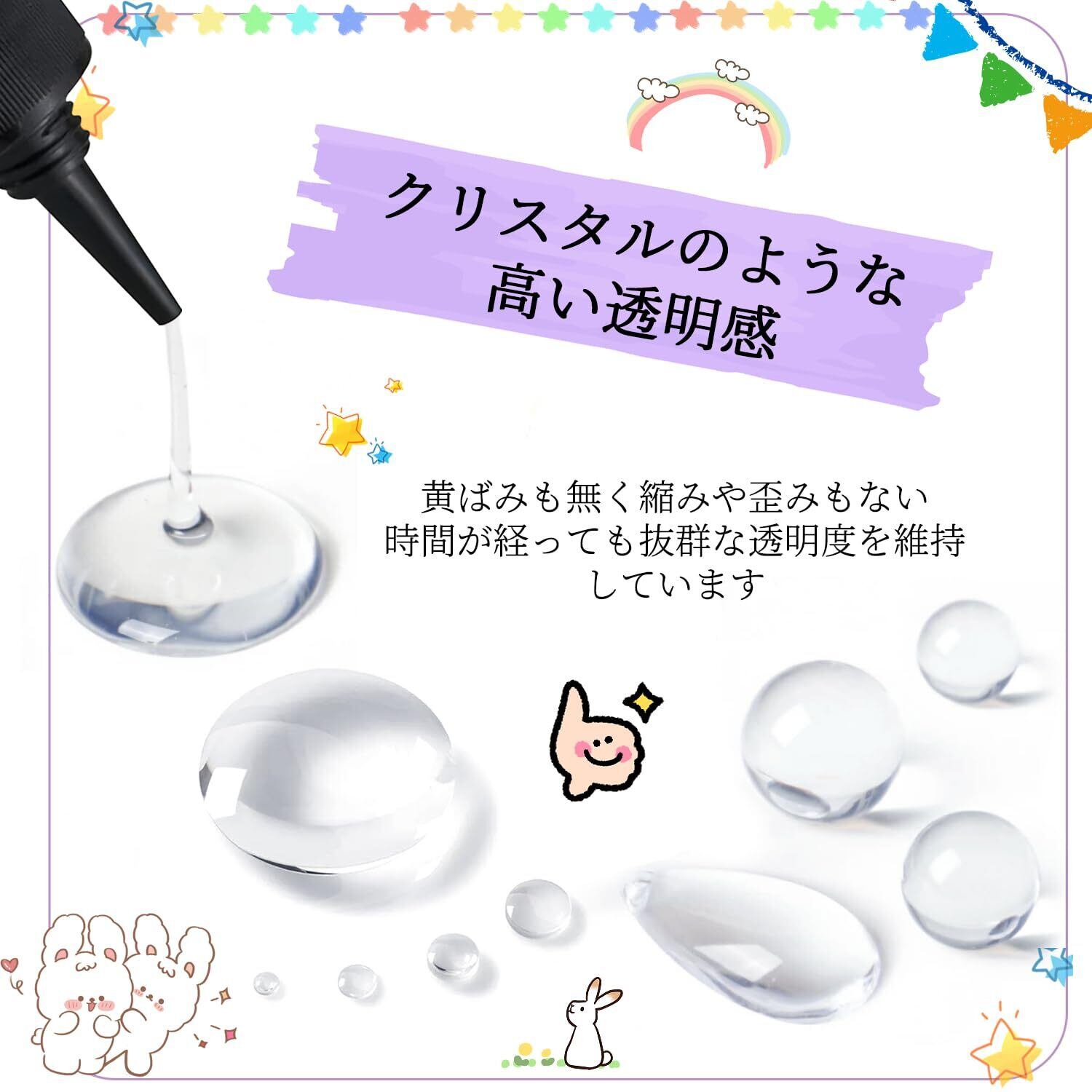 【急速硬化】エポキシレジンに比べて、硬化時間は短く、UVライトに当たって2分ほどかかると硬化できます太陽光でも硬化させることができて、せいぜい5分以内です短時間でキレイな仕上がりをお楽しみいただけますノズルのデザインで液体をモールドに注ぐのに役立ちますノート:色料を入れすぎて紫外線がレジン液に当たらずに硬化不良を起こしますため、ご注意ください