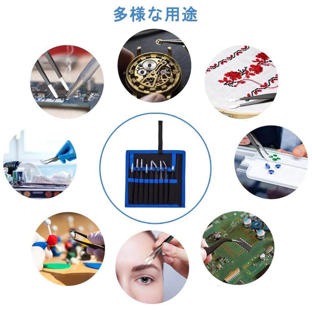 【静電防止】このピンセットは静電気防止の機能がありますが、光の反射を防ぎ、目が疲れません。収納袋付き、持ち運びにも便利です。