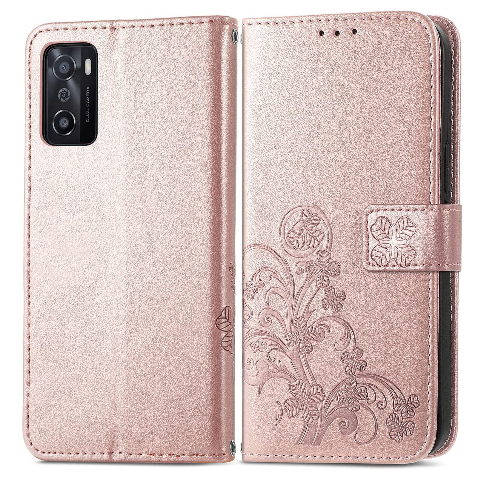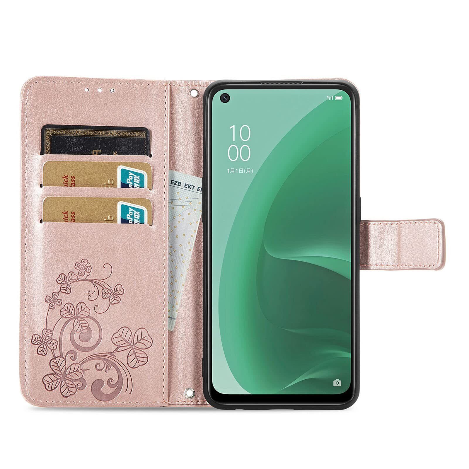 【新春セール】に適用するOPPO A55s 5G ケース 手帳型 ノートブック型携帯電話保護カバー多機能携帯電話ホルスター財布携帯電話ホルダーバンプパターンテクスチャ耐久性摩擦耐性携帯電話ケース男性と女性に適した多色オプション (四つ葉のクローバーローズゴールド)