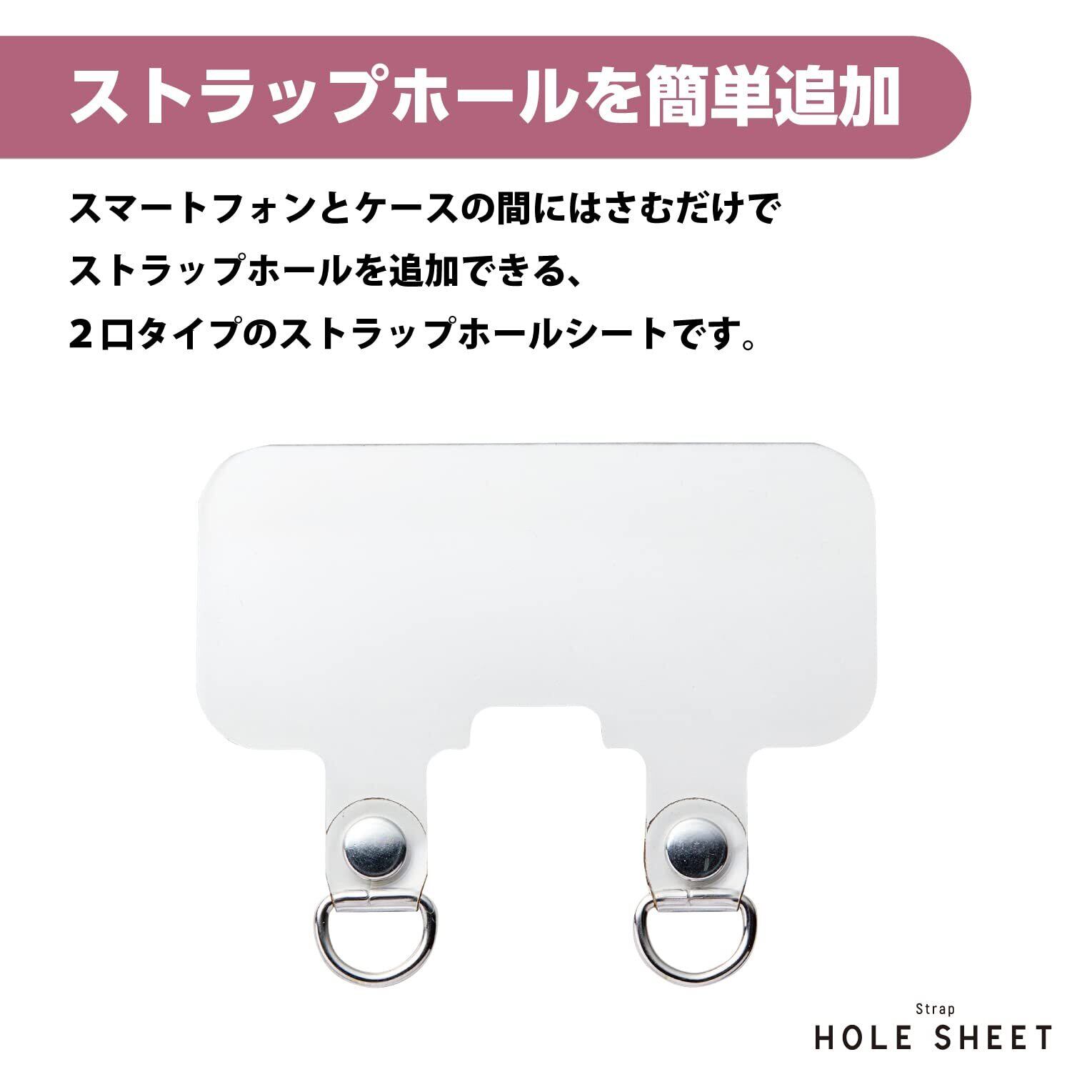 スマートフォンとケースの間に挟むだけでストラップホールを追加できる、2口タイプのストラップホールシートです。