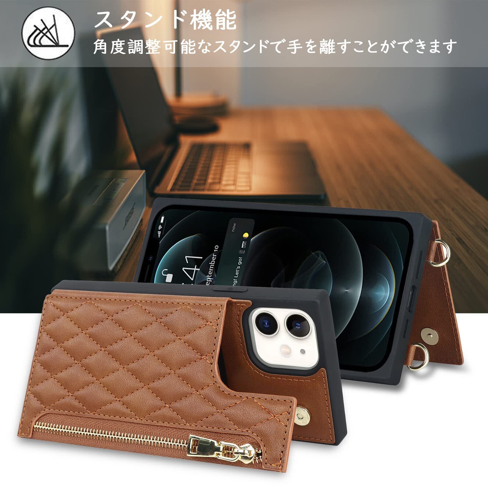 【2022最新】【Hamany】 いphone12 ミニ ケース ショルダー iphone 12 mini ケース 手帳型 クロスボディ グリッドパターン アイホン12ミニケース ジッパー式 ストラップ付き 刺繍 スマホケース iphone 12mini 肩がけ 首掛け 斜め掛け 収納 ファスナー型 耐衝撃 レザー カバー-茶褐