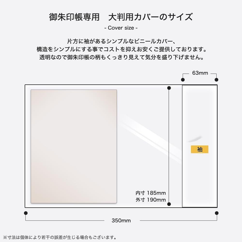 【サイズ】大判(12x18㎝御朱印帳向け)縦外寸:19㎝ 縦内寸18.5㎝ 横幅:35㎝ 袖寸法:6.3㎝ ※ご注文の際のサイズの間違いが多いです。一般的に大判と言われる御朱印帳向けとなります、誤って小型御朱印帳を入れても1㎝程余って大変不格好になりますのでご注意ください。小型の場合は小型用のビニールカバーをお求めください。