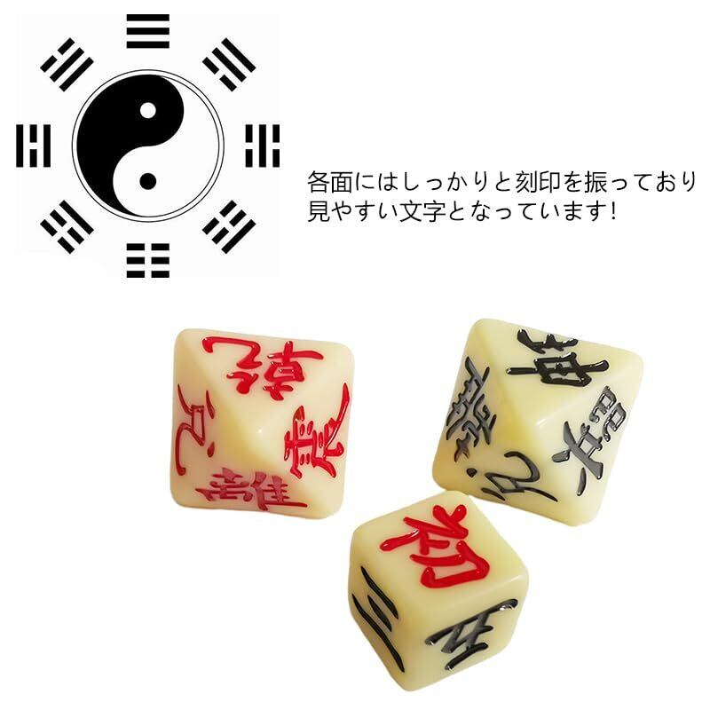 【商品仕様】易占い用サイコロ3個、パッケージ内容:八面体ダイス×2、六面体ダイス×1、八面体(サイズ:約1.8×2.2cm)、六面体(サイズ:約1.2×1.2cm)、材質:高品質の樹脂製で。