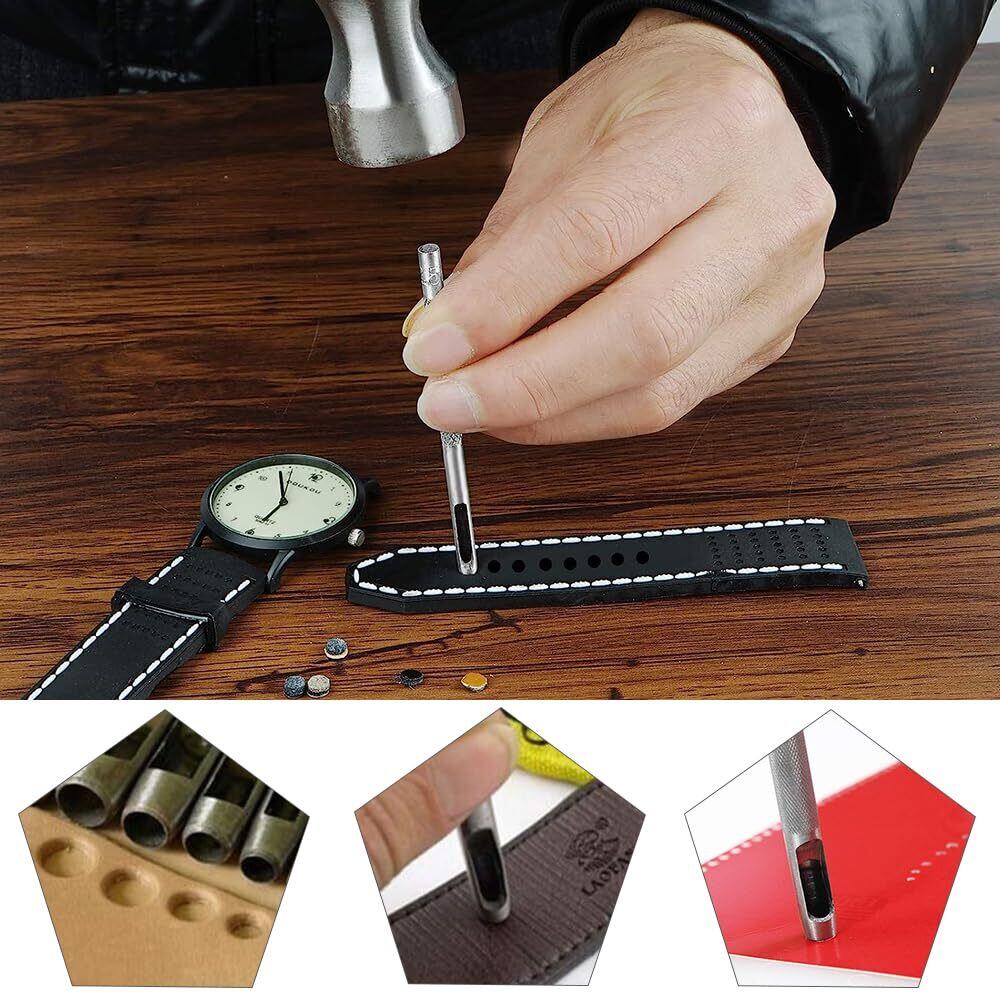 サイズ:直径サイズ(約)は2.5mm、3mm、4mm、5mm、6mm、7mm、8mm、9mm、10mmの9種類ポンチセットで。さまざまな穴あけニーズに対応できます。時計、財布、布地、紙、ベルトなど、さまざまな素材に対応したサイズがあり、異なるプロジェクトに簡単に対応できます。