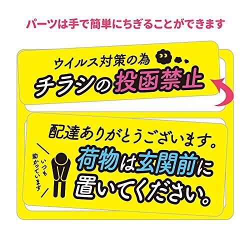 「ウイルス対策の為チラシの投函禁止」「配達ありがとうございます。荷物は玄関前に置いてください。」の2つのメッセージが1シートに入っていて、それぞれ抜き取って鉄製の玄関ドアや宅配ボックス、ご家庭のポストなどにつけて使えます。シンプルで分かりやすいデザイン。マグネットなので、つけはずしも簡単です。
