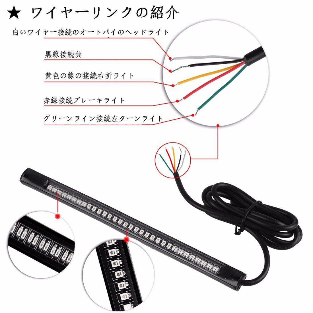 【インストールが簡単】 - 白いワイヤー接続のオートバイのヘッドライト、黒線接続負、黄色の線の接続右ウインカーライト、グリーンライン接続左ウインカーライト、赤線接続ブレーキライト。