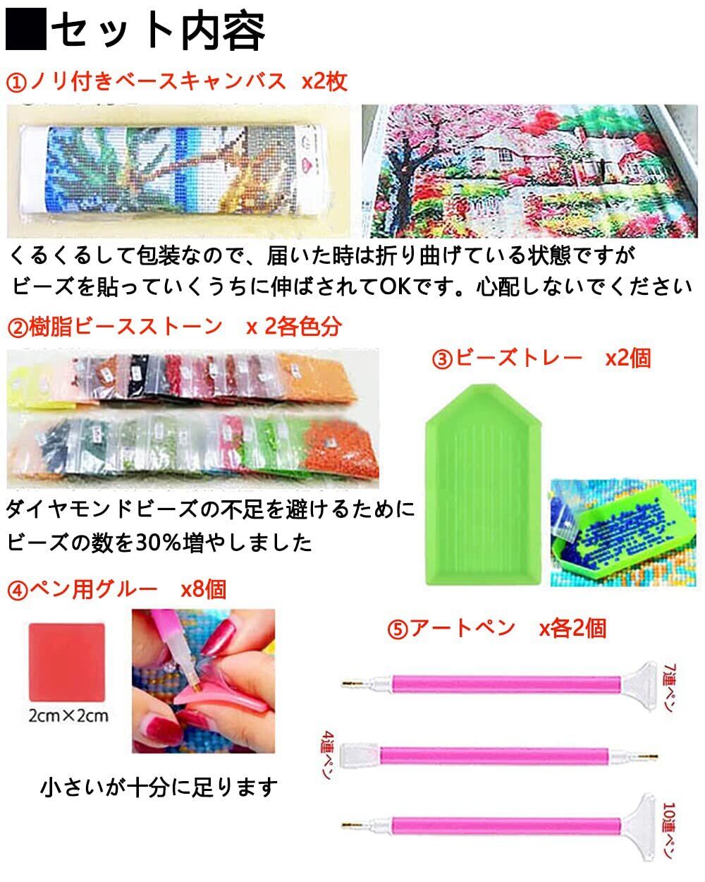 【ダイヤモンドアート キット内容】--2枚セットの5Dダイヤモンドアート、2枚のラベルステッカー、8個のグルー、6本のダイヤモンドペン、2個のビーズトレイ。(ダイヤモンドビーズの不足を避けるために、ビーズの数を30%増やしました。)本セットがあれば手軽にダイヤモンドアートを始めれます。