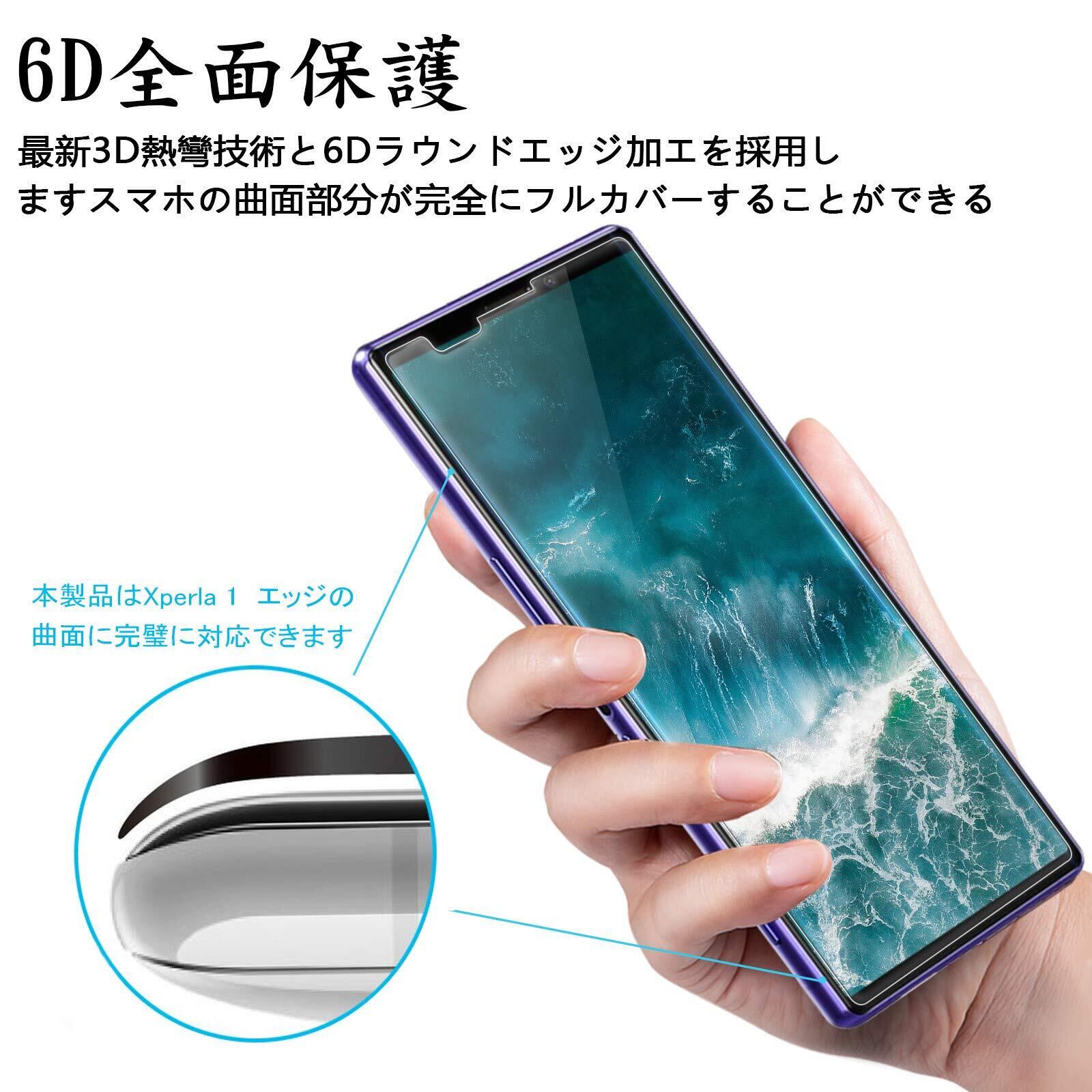 【2枚入りなのでさらに安心、誰でも簡単貼り付け】2枚の Xperia1ガラスフィルムが付属しています。貼り付ける際にホコリが入ってしまっても大丈夫。貼付け位置を正確に確定できたら、指で真ん中から端に向かって軽く押すだけで、気泡もなく綺麗に仕上げることができます。他社の製品では、貼り付けた後に縁のところが常に気泡残り、除去もできず、外見やタッチ感度などに大きな影響がされます