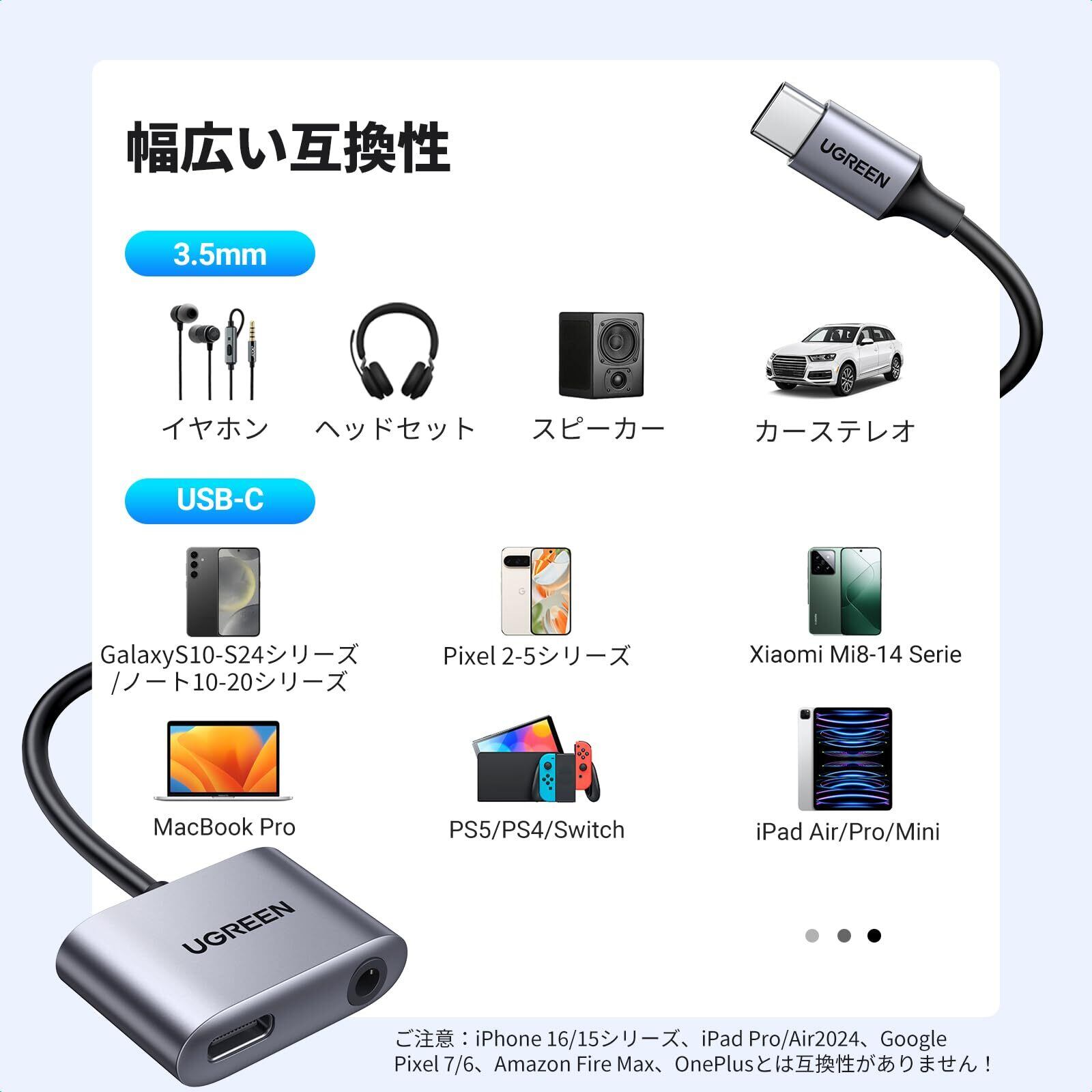 【ご購入前にご注意ください】このタイプC イヤホン 変換アダプターはiPhone 15 シリーズ、iPhone 16シリーズ、Google pixel 6/6pro/7/7a、iPad pro2024、iPad mini 2024、OnePlus に非対応です。充電についてSamsung PPS 25W および PPS 45W はサポートしません。Samsung シリーズでは最大 15W の充電のみをサポートします。