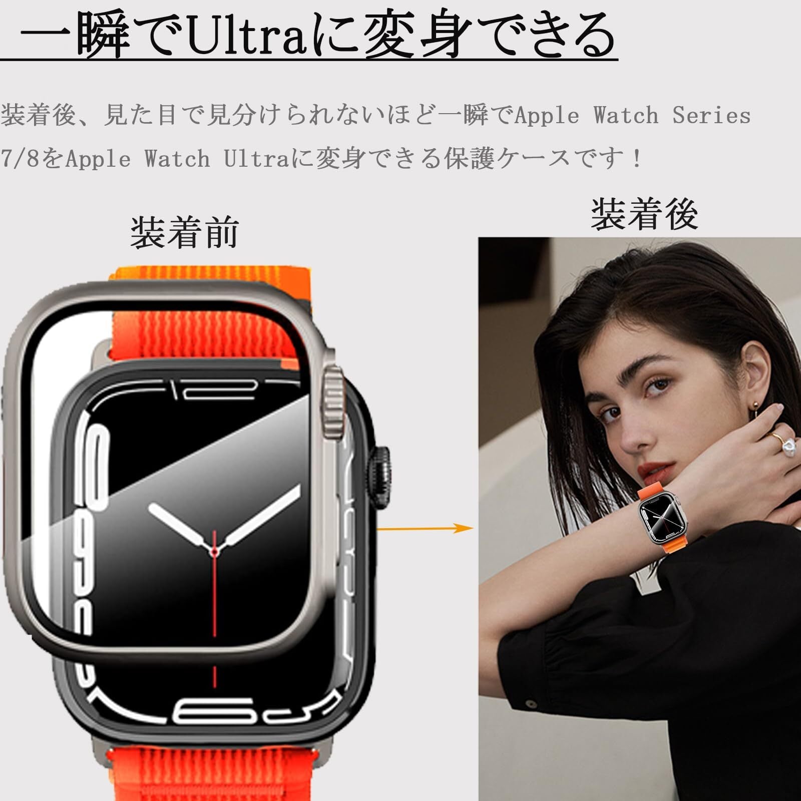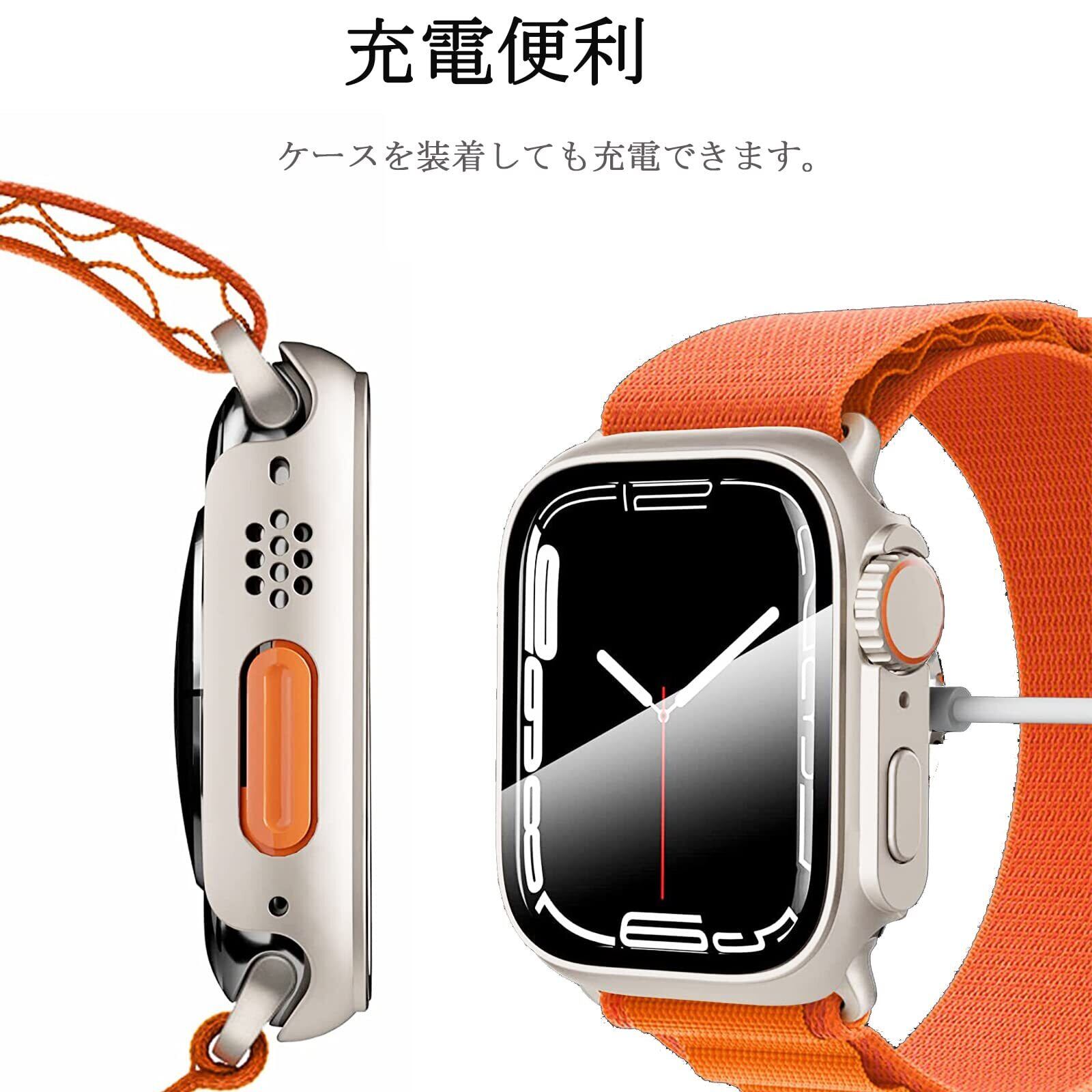【一瞬でUltraに変身できる|高級な素材】装着後、見た目で見分けられないほど一瞬でApple Watch Series 7/8をApple Watch Ultraに変身できる保護ケースです!硬度9HガラスフィルムとPC材質の枠革新的な一体型デザイン、2in1ケースデザイン、配色も高級です。最高レベルの9H硬度の強化ガラスフィルムはApple Watch シリーズ 8の保護機能を更にアップします!落下、衝撃、擦れ傷など一切心配ありません。
