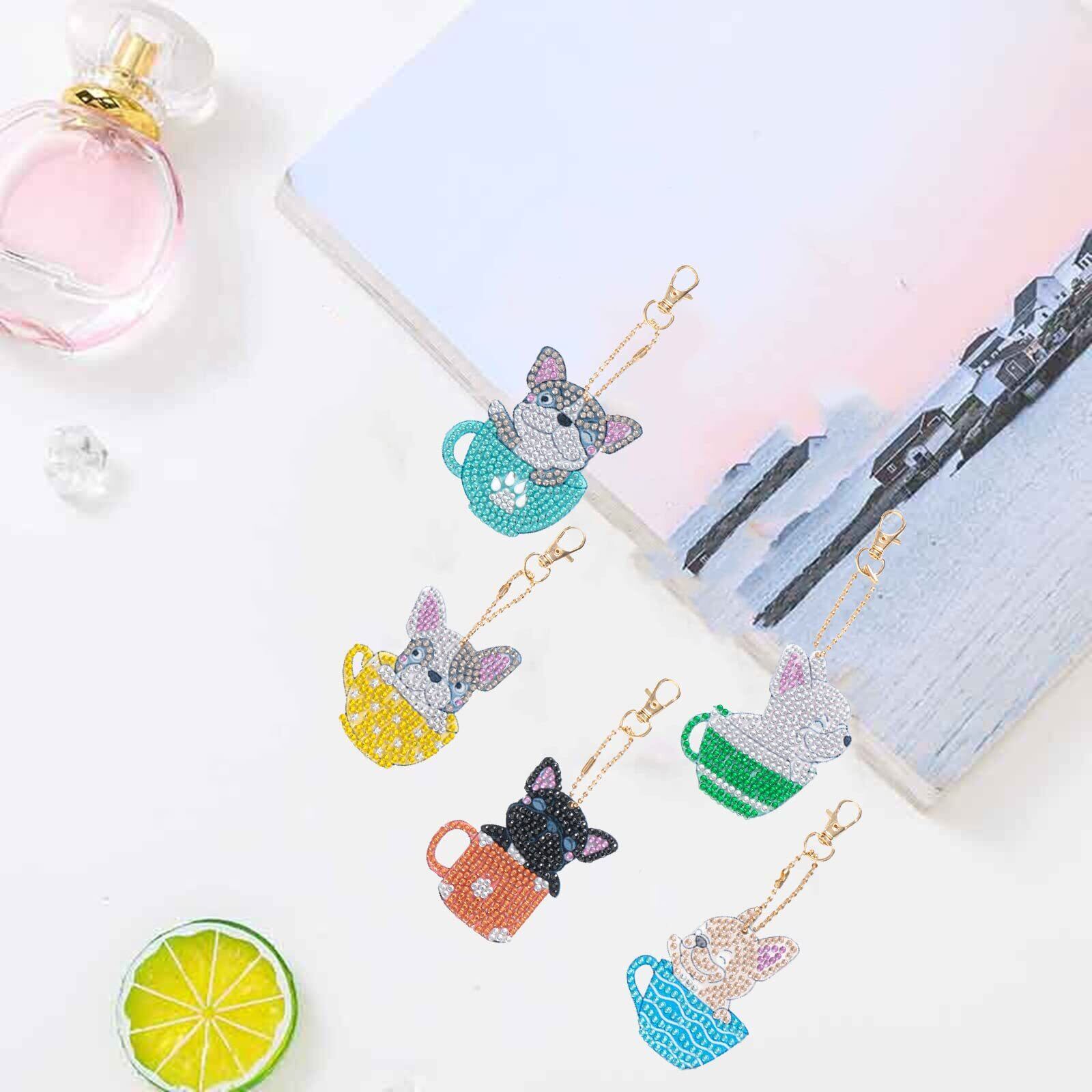 Amyaker ダイヤモンドアート キット DIY キーホルダー 5Dダイヤモンド塗装キット ダイアモンドビーズ キーホルダー 両面全貼り付け DIY手作り キーホルダー 財布 キーペンダント バッグ 装飾用 コップ犬 5個入
