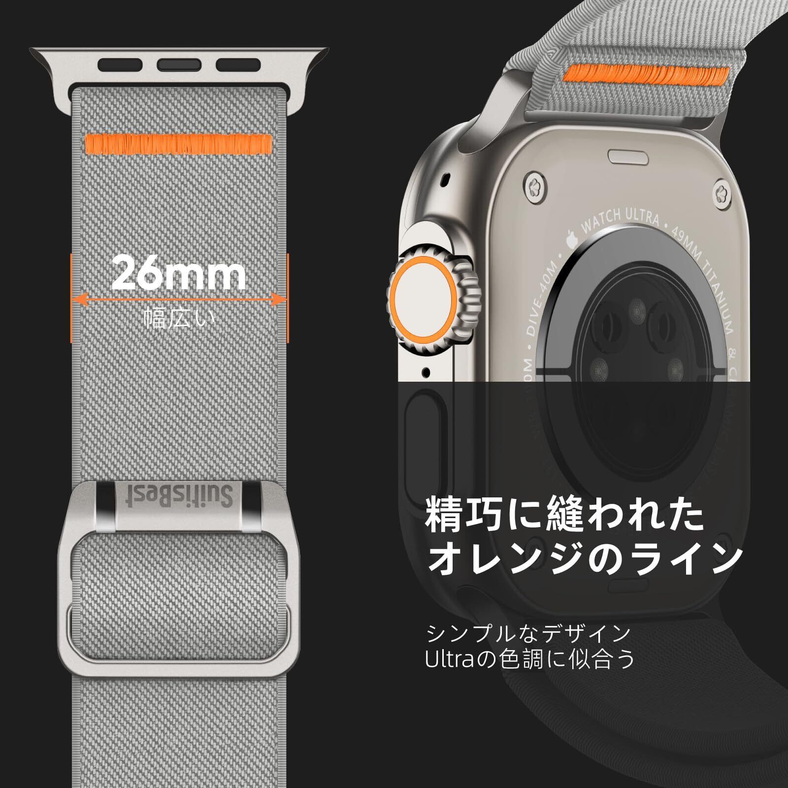【シンプル・幅広設計】男性向けの26mm幅広に仕上げたApple Watchバンドです。幅広のデザインでUltraによく似合って、腕にフィットしている安定感もあり、激しいスポーツをしてもアップルウォッチ落下の心配もないです。精巧に縫われたオレンジラインと高級感であるバックル、シンプルなデザイン、Ultraの色調にも似合って、かっこいい見た目です。