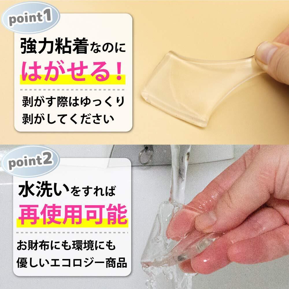 【何度もくり返し使用可能】粘着性は高いのに、接着面を痛めずのりが残らずきれいにはがせます。汚れた時はさっと洗って乾かすと粘着力が復活し、くり返し使用可能です。 ※ジェル部分に吸着せずに脱落する場合は、中性洗剤などで洗浄いただき、設置面を脱脂して頂ければ吸着力が復活し、再度ご利用いただけます。