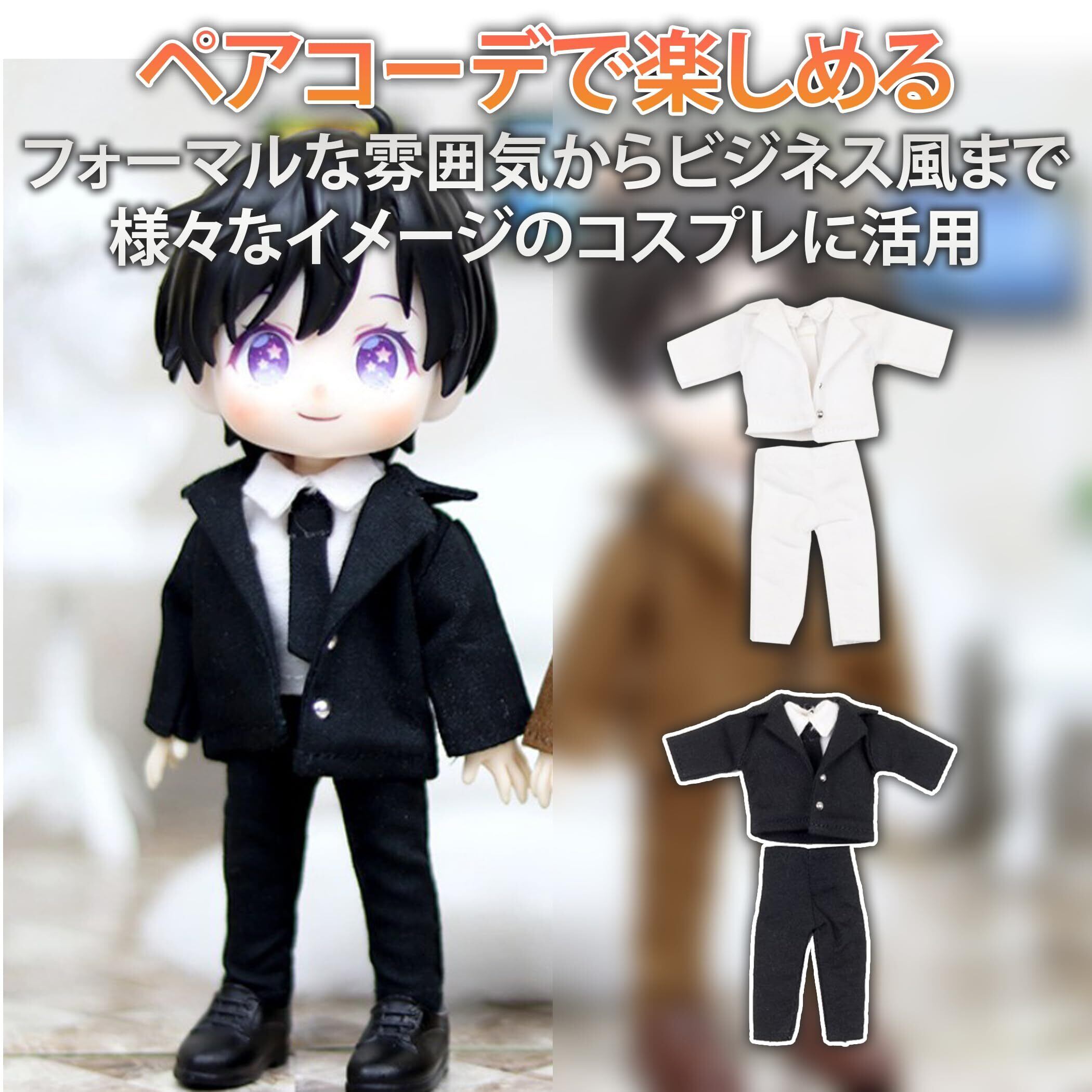 ペアコーデで楽しめるお得なセット:こちらは、ホワイトとブラックのコントラストが美しい2色のスーツセットです。2体のob11に着せればペアコーデとして世界観を楽しむことが出来ます。フォーマルな雰囲気からビジネス風まで様々なイメージのコスプレに活用できます。
