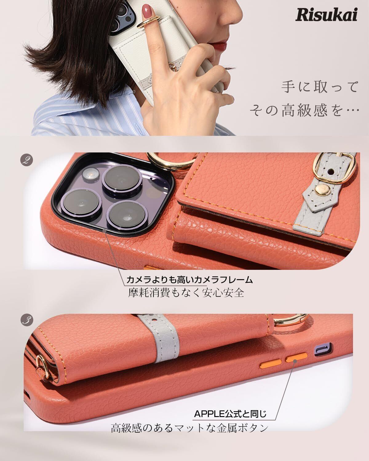 【在庫セール】【RISUKAI】Apple MFi認証済み スマホショルダー ストラップ スマホケース iPhone14 ケース カード収納 肩掛け ミラー付 背面手帳型 iPhone14 韓国 デザイン iPhone (iPhone6/7/8/se2/se3, エトープ)