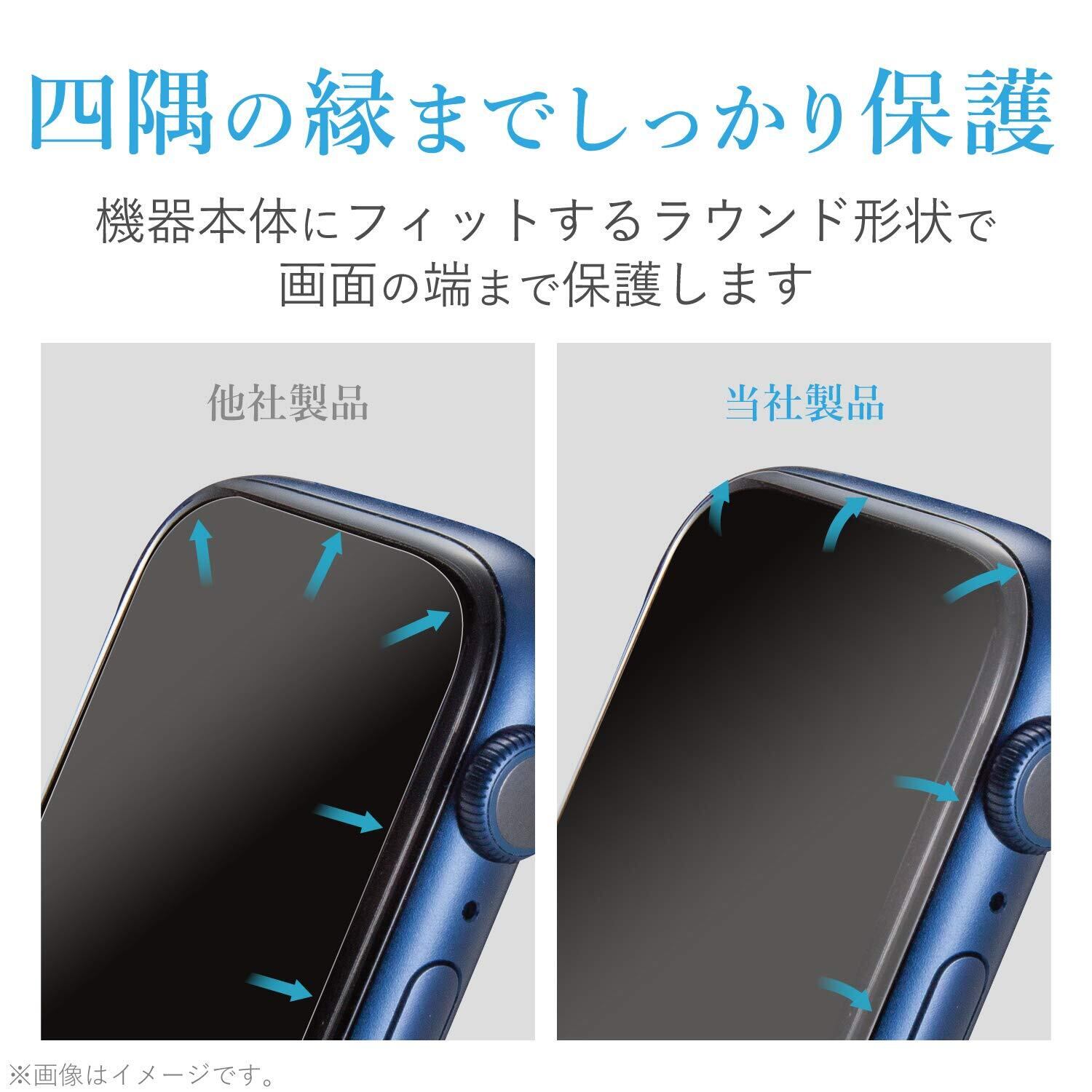 画面の曲面に沿った3D設計で、端末のデザインを損なわずに衝撃から守るブルーライトカットタイプのApple Watch SE、Series 6、5、4 [44mm]用フルカバーフィルムです。