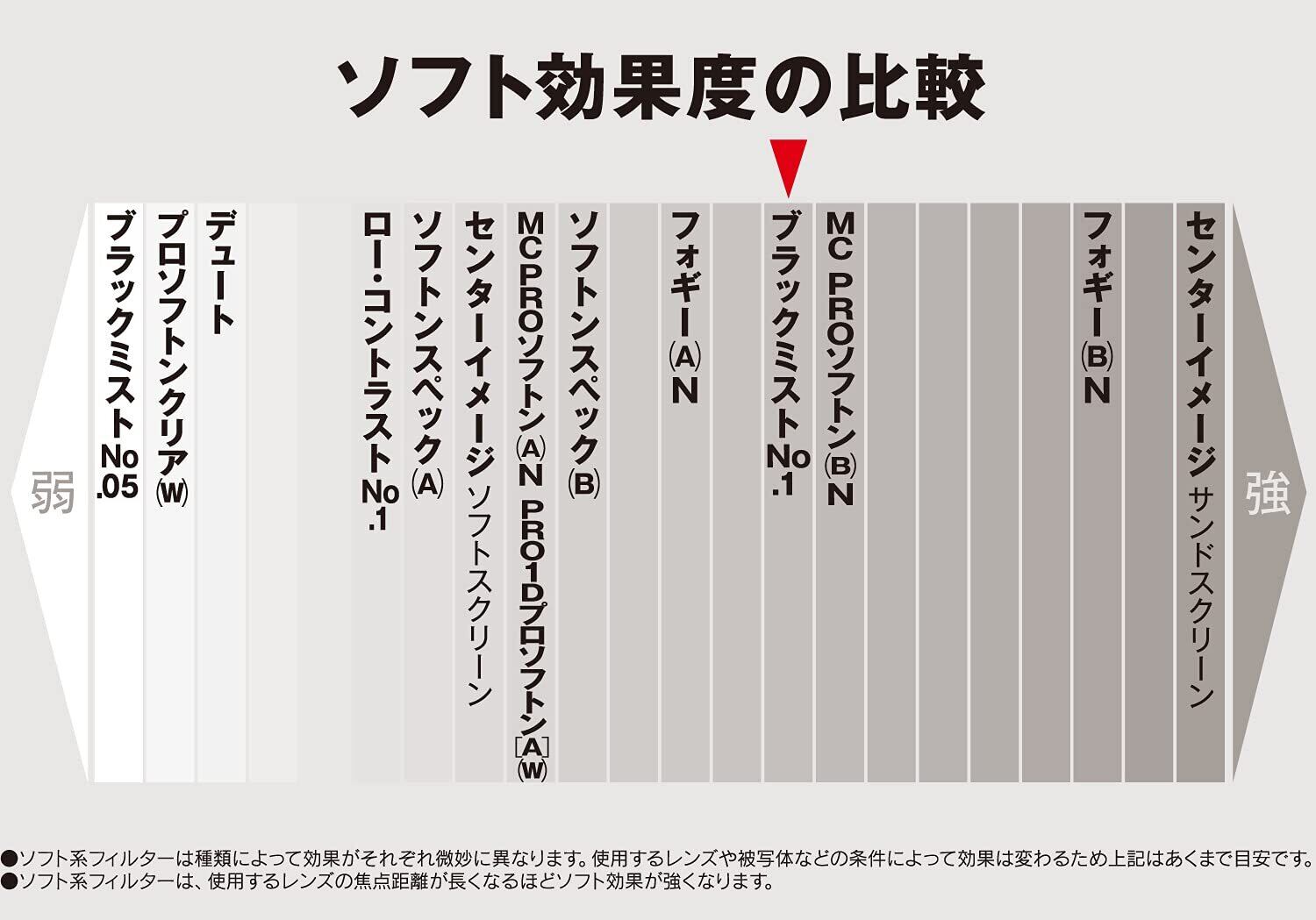 非常に微細な黒い拡散材を光学ガラスに内包したフィルターです。光の回折によりハイライト部とシャドー部のコントラストを弱め、くせのないソフト効果をつくります。露出倍数約1.25倍(約1/3絞り分)製品の特長:他のソフトフィルターは画面を白っぽくしてしまうのに対し、ブラックミストは画面を白っぽくしません。そのため黒バックでの撮影や、暗い背景での撮影にも向いています。ソフト専用レンズと異なり、絞りを絞り込んでもソフト効果があり、ズームやマクロなどでもフィルターをつけるだけでソフト効果を得ることができます。