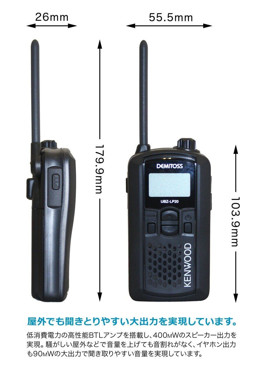 ●「ecoモード」を搭載し、最長100時間の運用が可能 ●「電波メーター」を搭載し、受信状況の確認が可能 ●IP54相当の防塵・防水機能を搭載 ●利用シーンに合わせて選べる4色のカラーバリエーションを採用 ●低消費電力の高性能BTLアンプを搭載し、屋外でも聞きとりやすい大出力を実現 ●ハンズフリー運用を可能にする「VOX機能」「PTTホールド機能」を搭載 ●シンプレックス20チャンネルに対応し、従来の“DEMITOSS”シリーズとも交信可能 ●暗がりなどで手探りでも操作できる「回転ボリューム&シンプル操作キー」を装備 ●グループモードと合わせて、第三者による通話の聴き取りを防ぐ「ボイススクランブルモード」を搭載 ●残りの通話量をひと目で確認できるバッテリー表示機能 ●約180g(単3乾電池3本含む)の軽量・コンパクト設計