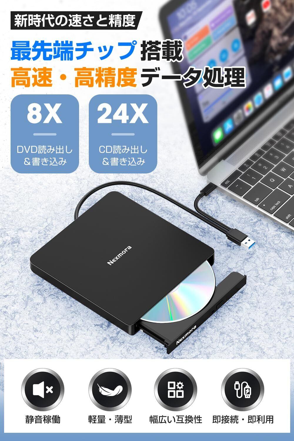 【USB3.0高速転送・読取&書込可】最高のパフォーマンスを求める方へ。USB3.0接続で、データ転送速度も向上。仕事や趣味に最適な、高性能かつ信頼性の高い 外付けdvdドライブ です。さらに、 cd dvdドライブ 外付け は、8X DVDと24X CDの高速読み取り&書き込み能力を備え、データの読み込みと保存が迅速かつ効率的に行えます。※使用するディスクの種類やコンピュータの設定によって実際の速度は異なる可能性があります。特に古いまたは低品質のディスクを使用した場合、最大性能が出ないことがあります。