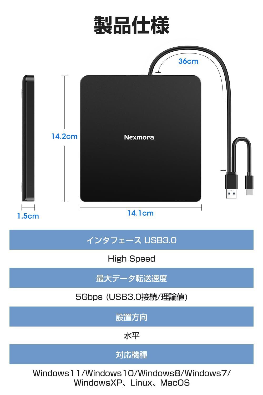 特徴 高速転送,静音,Mac&Windows両対応,幅広いメディア対応,軽量,薄型,ポータブルdvdドライブ