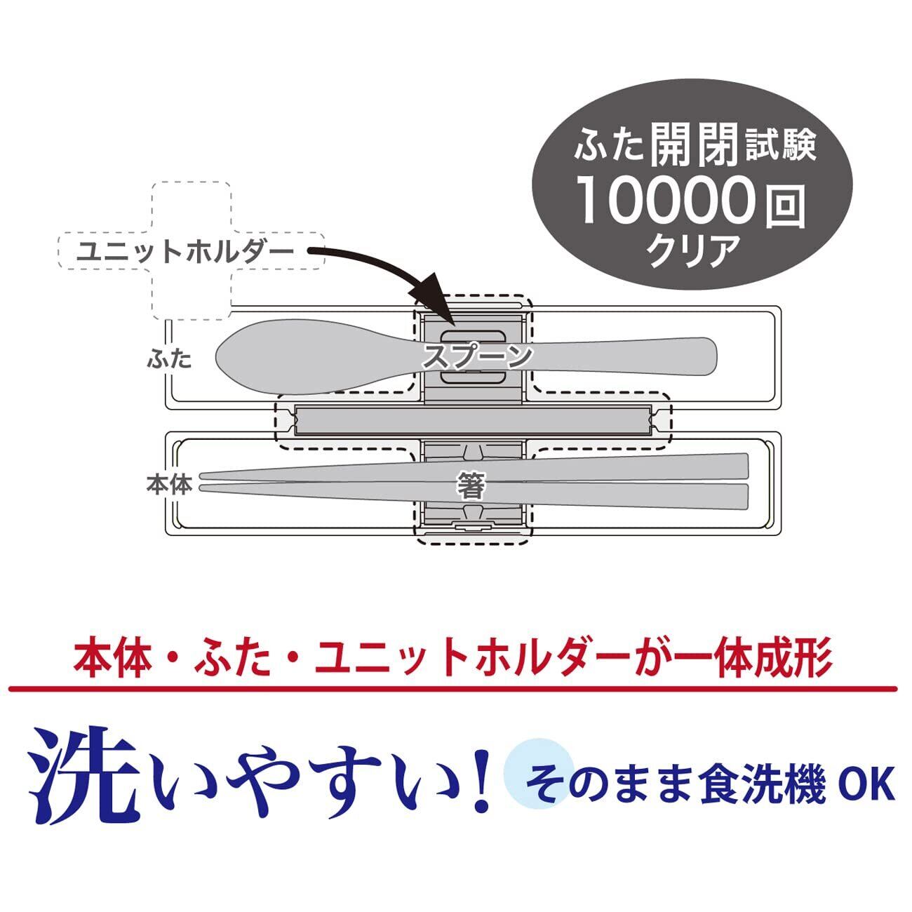 〇ケースが壊れにくく、カチャカチャ音防止ホルダー付きの箸箱セット。 〇ケース本体とフタ、スプーンに衝撃に強い樹脂、飽和ポリエステルを採用。 さらにケース本体・フタ・カチャカチャ音防止ユニットが一体式で部品が少なくお手入れが楽。 〇持ちやすい六角箸、食洗機OK、清潔仕様の銀イオンで抗菌(箸)防汚加工(箸) 商品サイズ : 幅35×奥行190×高さ22mm 商品重量 : 76g ケース本体・スプーン : 飽和ポリエステル ユニットホルダー部 : 熱可塑性エラストマー 箸 : AS樹脂 生産国 : ベトナム