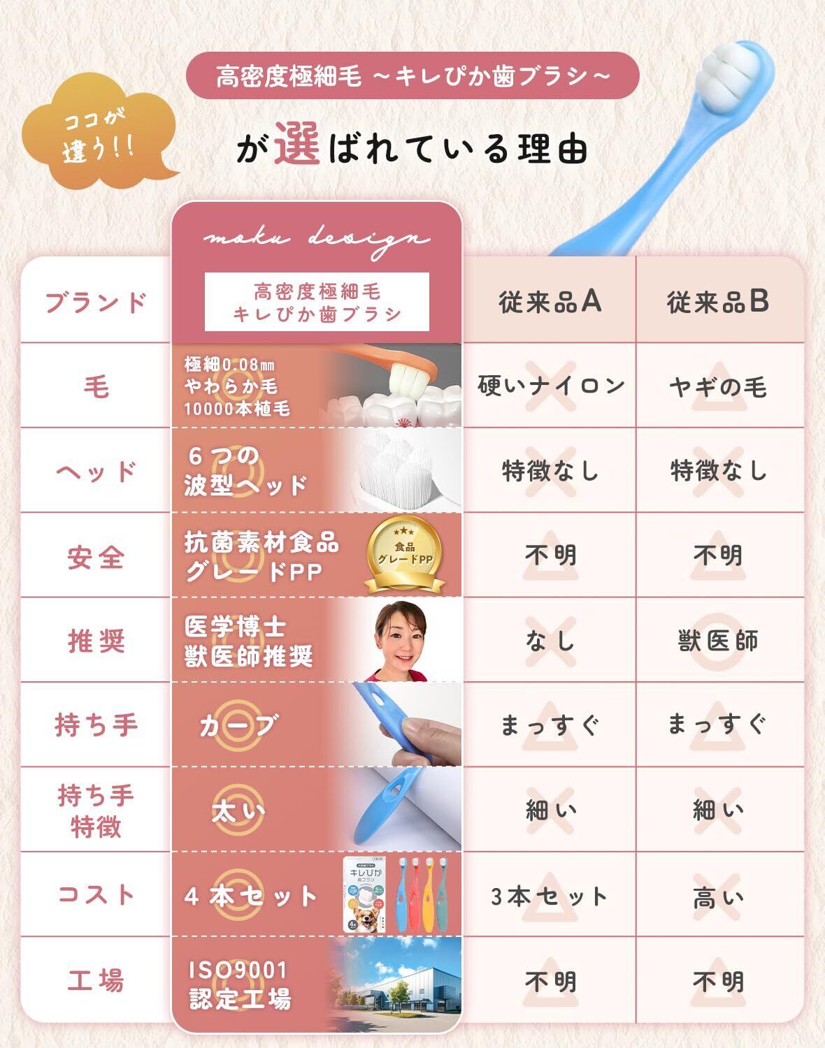 【人気商品】犬 歯ブラシ 小型犬【犬の専門家推奨 x 10000本植毛が強力洗浄】 『キレぴか歯ブラシ』 【柔らかく歯茎に優しい x 0.08㎜極細毛】小型犬用5kgから 4本セット 食品グレード 抗菌素材 (4)