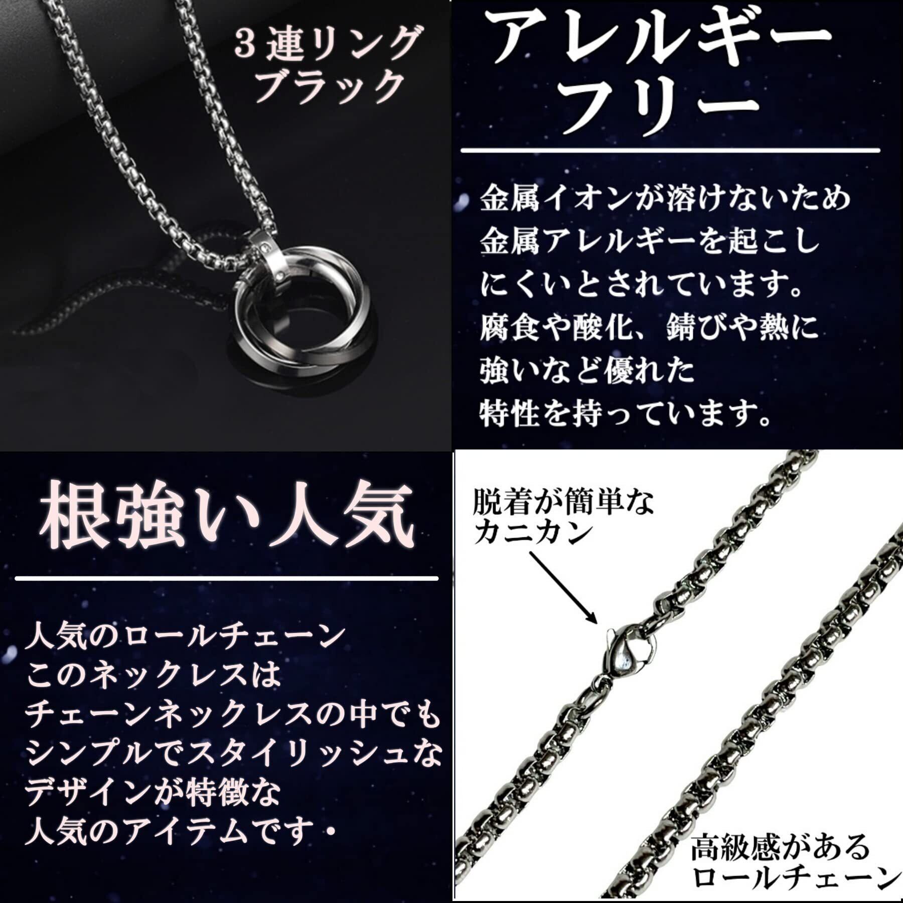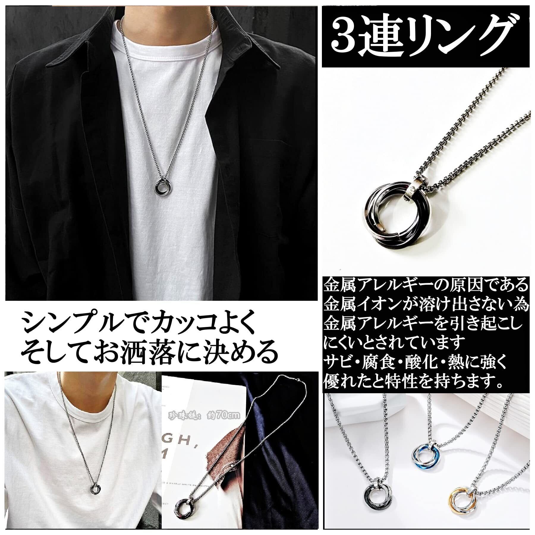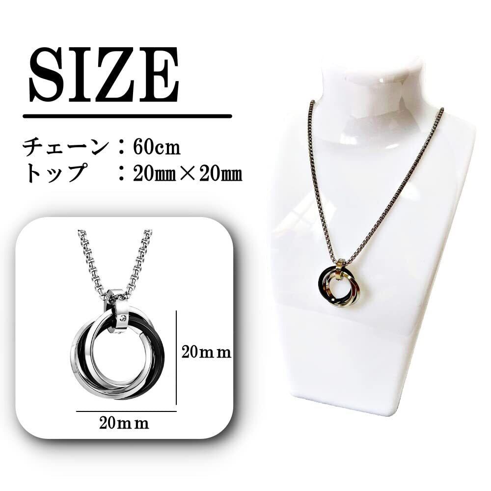 [YAHANE] ネックレス メンズ ペンダント ダブルリング 3連リング シンプル ステンレス アクセサリー シルバー ブルー ブラック ゴールド トップ ジュエリー アレルギーフリー 防水