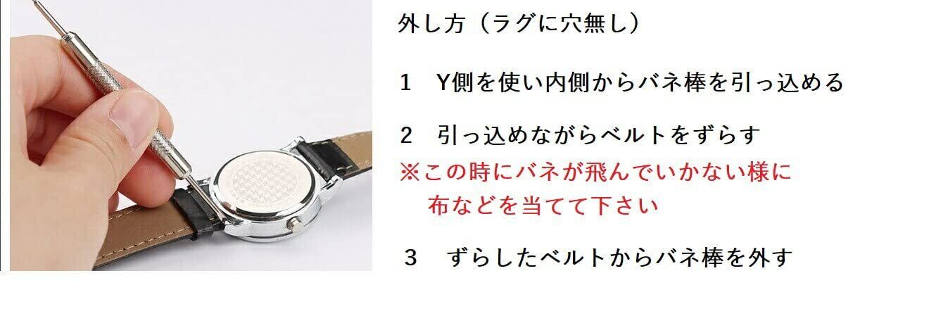 腕時計のバンド交換に必要なばね棒3本とバネ棒外し工具のセットです。バネ棒は3本入っているので安心して使えます※交換方法はペーパーレス化の為、商品画像を参考にお願いします。【素材】錆びないステンレス製