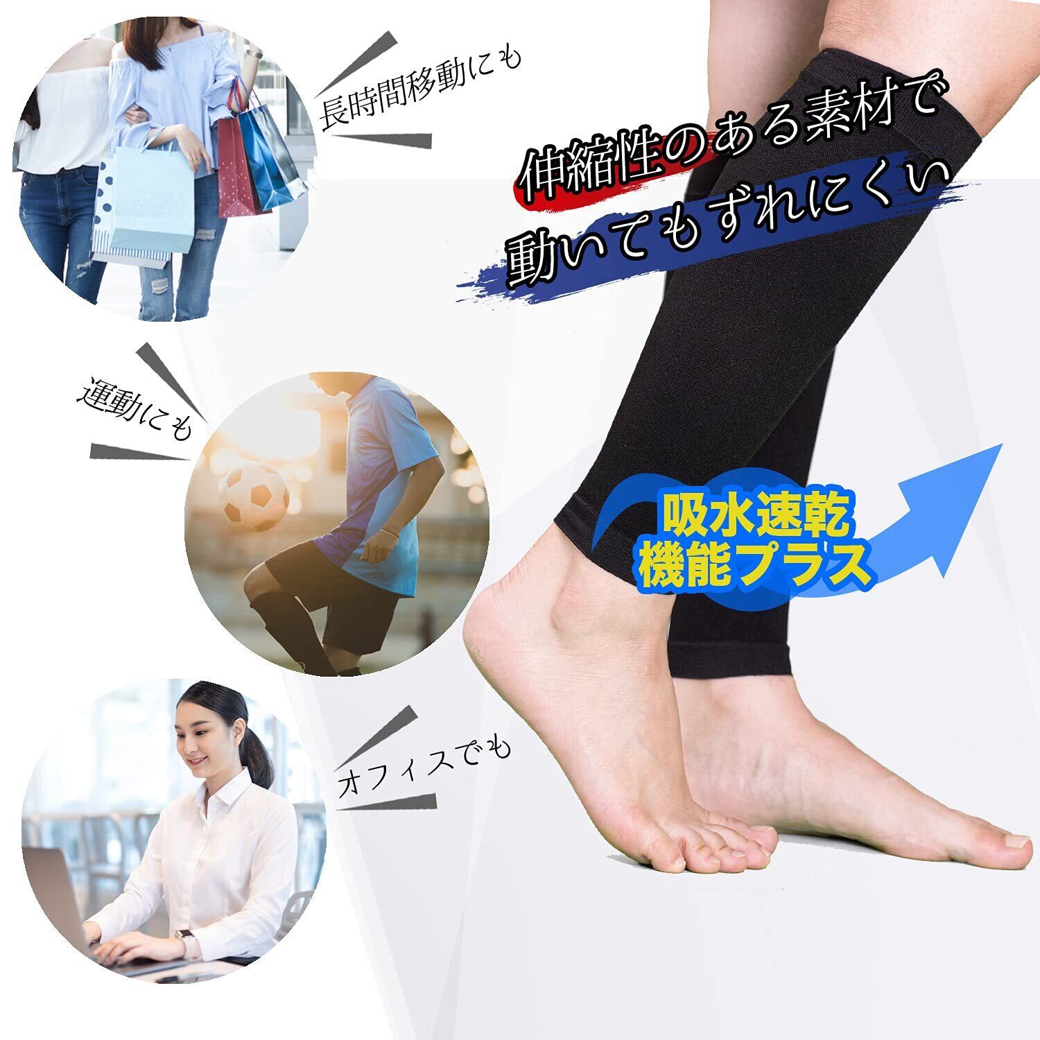 【血流サポートで疲労・むくみの軽減】ふくらはぎの筋肉が持つポンプの役割をサポート。ふくらはぎの収縮活動を助け血液を心臓にしっかり送り返すことで、足がむくんだり、だるくなったりという症状を緩和。