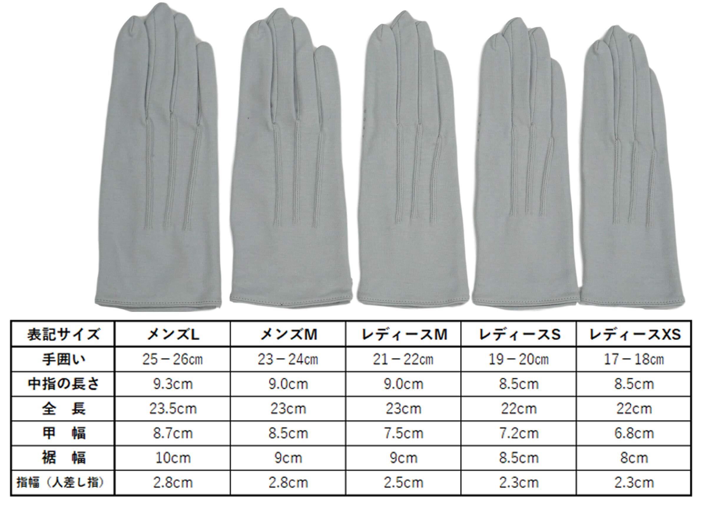 〔素材】:コットン100% 〔サイズ〕:レディースタイプ:XS,S,M メンズタイプ:M、L 〔カラー〕:ブラック、グレー、ホワイト 〔生産国〕中国 〔寸法〕メンズM:手囲い23-24㎝ 中指の長さ9㎝ 全長23㎝ 甲幅8.5㎝ 裾幅9㎝ 指幅2.8㎝ メンズL:手囲い25-26㎝ 中指の長さ10㎝ 全長23.5㎝ 甲幅8.7㎝ 裾幅10㎝ 指幅2.8㎝ レディースXS:手囲い17-18㎝ 中指の長さ8.5㎝ 全長22㎝ 甲幅6.8㎝ 裾幅8㎝ 指幅2.3㎝ レディースS:手囲い19-20㎝ 中指の長さ8.5㎝ 全長22㎝ 甲幅7.2㎝ 裾幅8.5㎝ 指幅2.3㎝ レディースM:手囲い21-22㎝ 中指の長さ9㎝ 全長23㎝ 甲幅7.5㎝ 裾幅9㎝ 指幅2.5㎝