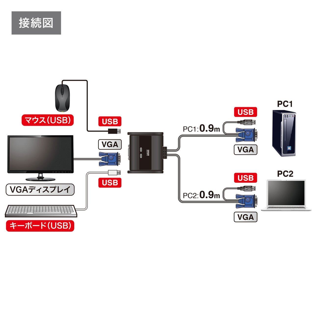 ・1組のUSBキーボード・USBマウス・ディスプレイで2台のパソコンを切り替えて使用できます。