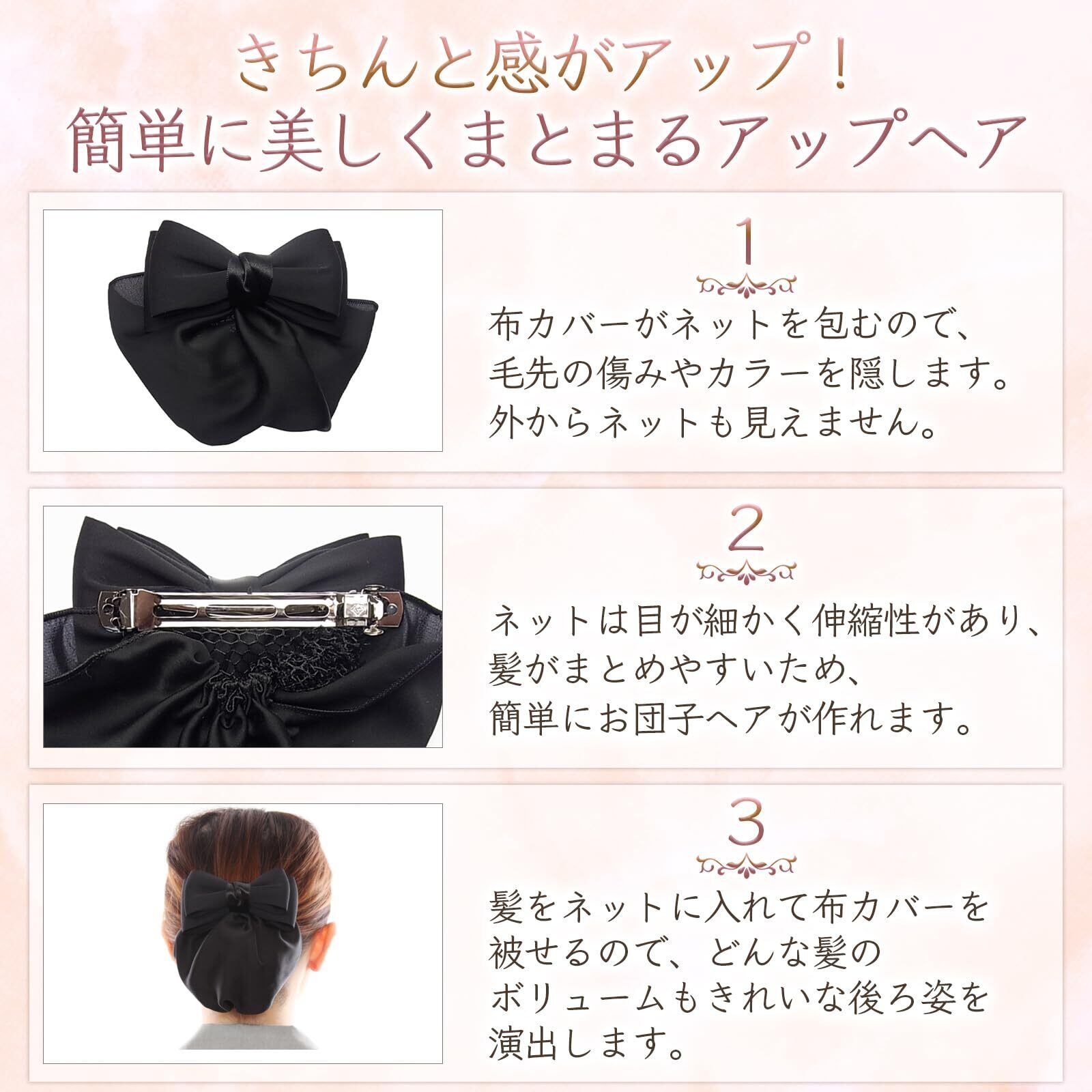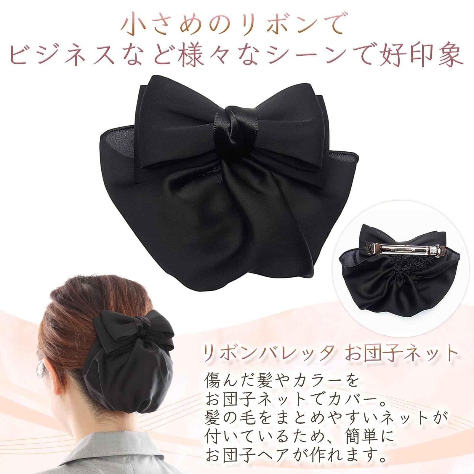 [美人髪KOEIDO] リボン バレッタ(ネットつき)お団子ネット シニヨン シュシュ 簡単 (ブラック) (ブラック)