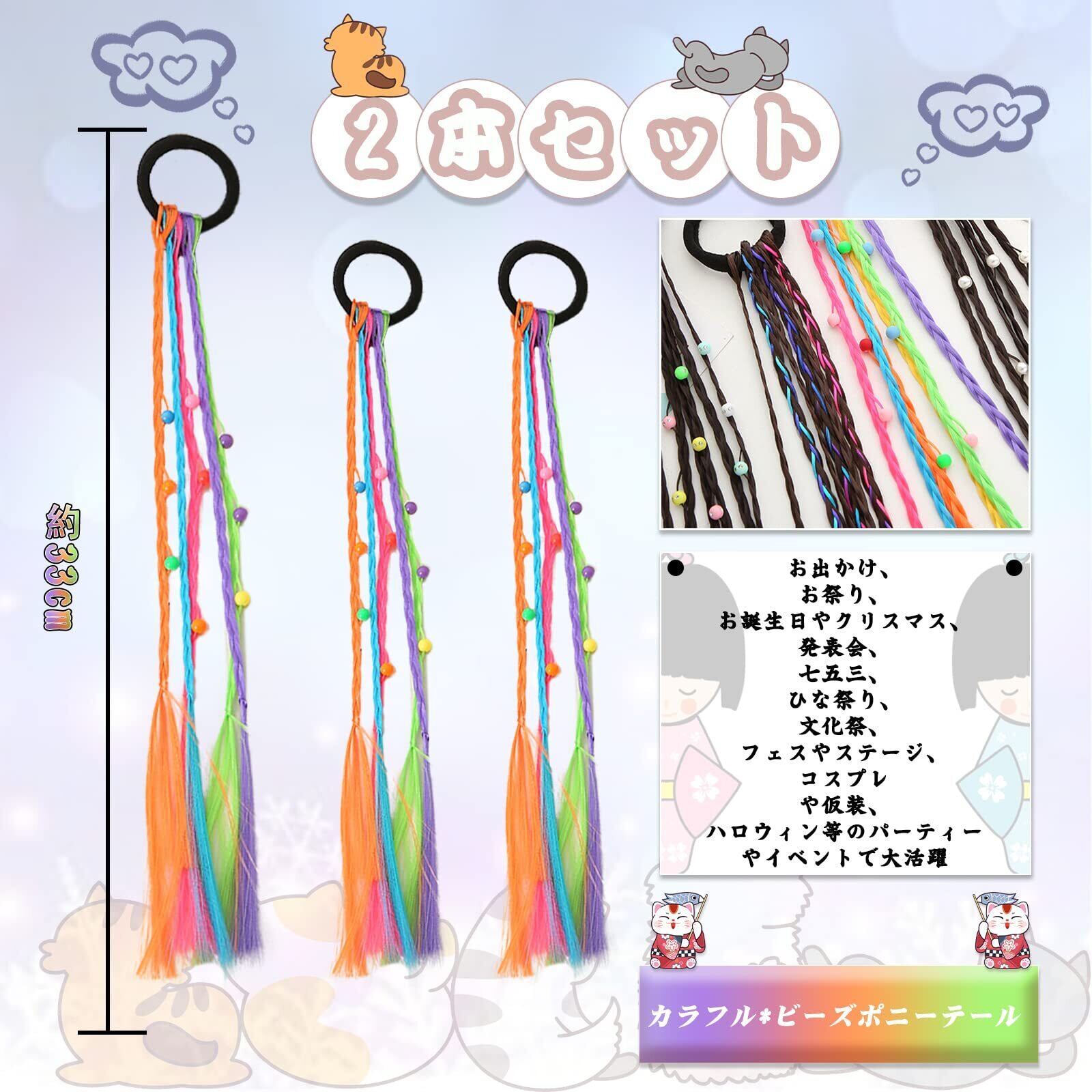 Hawkko ウィッグ エクステ 三つ編み 編み込み 子供 グラデーション ポニーテール つけ毛 ポイントウィッグ カラフル ウィッグ キッズ エクステンション ヘアエクステ ヒップホップ ダンス ゴム ひな祭り 発表会 パーティー 舞台用 派手髪 簡単装着 重ね付けOK 2個セット (カラフル*ビーズポニーテール)