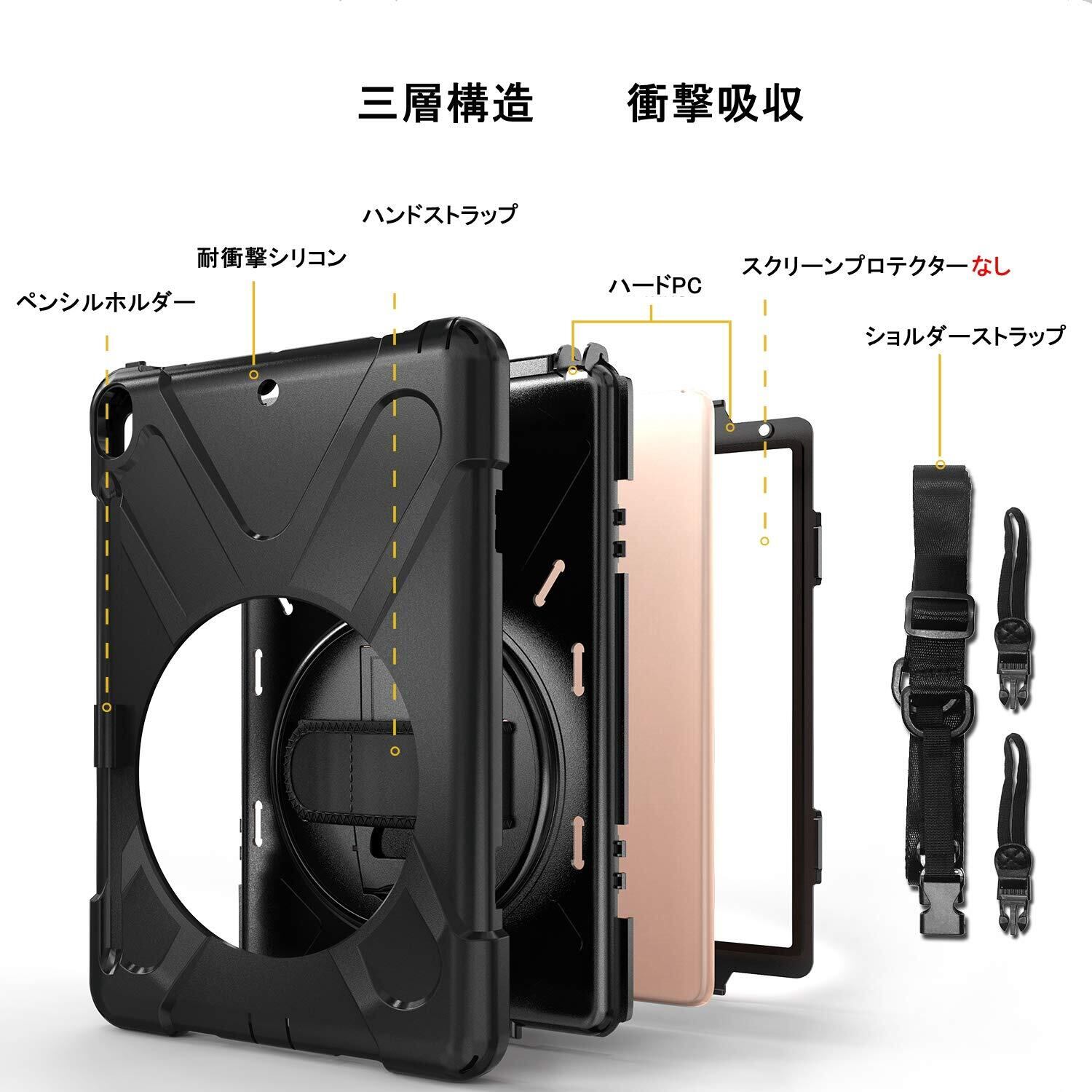 iPad Air3 ケース 2019/iPad Pro 10.5 ケース 2017 ペンホルダー Pencil収納, Lively House ショルダー 肩掛け シリコン 360度 回転 キッズ 子供 ハンドホルダー スタンド ストラップ キャリー ゴム シリコン 三層 耐衝撃 防塵 丈夫 頑丈 片手 傷つけ 落下防止 ハード アイパッド プロ 10.5 インチ ブラック