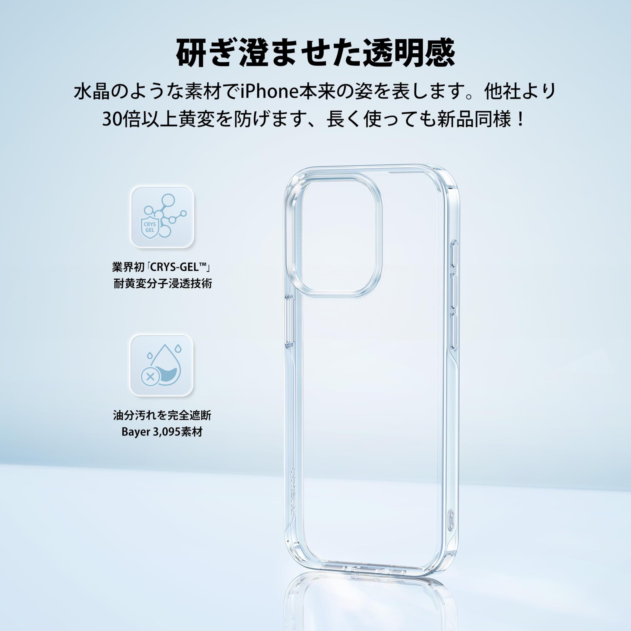 【業界初耐黄変技術・キレイに魅せる】 背面に高透明ダイヤPC素材を採用、さらに素材の芯まで最新技術「CRYS-GEL」分子浸透する事でクリアケースのよくある変色劣化を徹底防止!iPhone本来の美しさを損なわなず、洗練されたデザインを引き立たせる。 抗UV性認証番号:LCS210425017AR200|認証機関:LCS Compliance Testing Laboratory|認証時間:May 08, 2022
