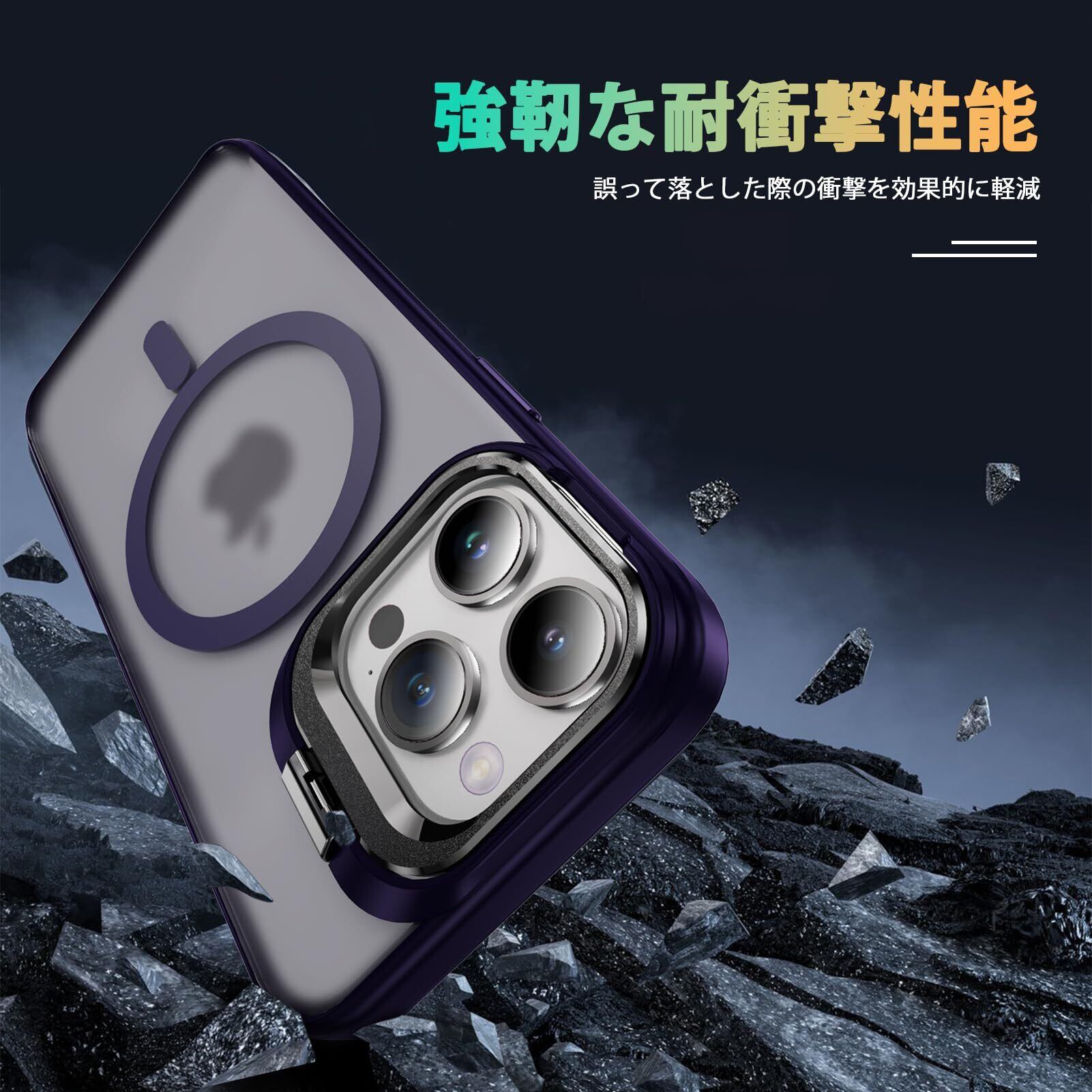 【数量限定】iPhone 15 用 ケース 耐衝撃 Magnetic対応 MIL規格 隠れスタンド ストラップホール付き ワイヤレス充電 リング付き 黄変防止 傷に強い背面 磁気スマホケース ダークパープル 14-ip15-02