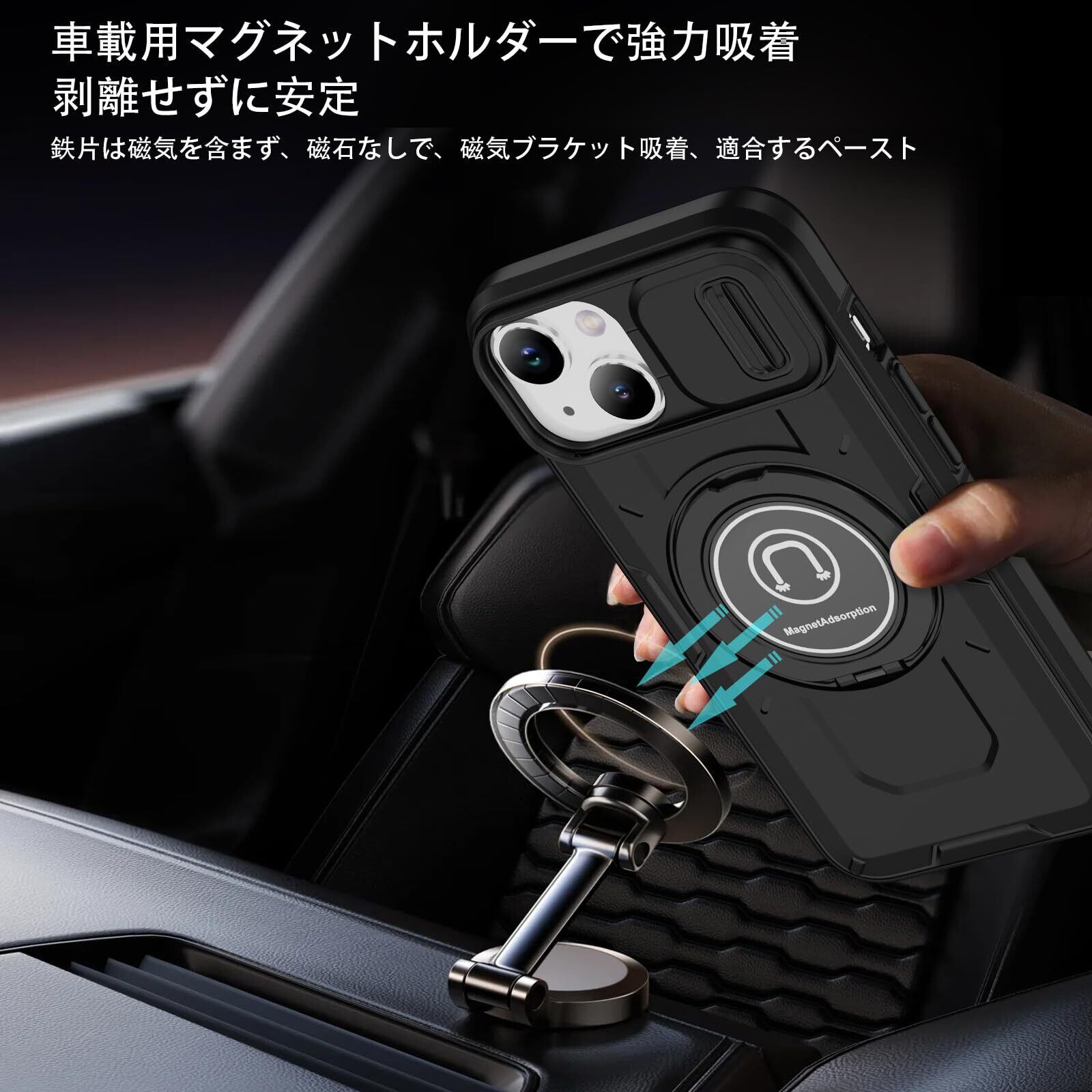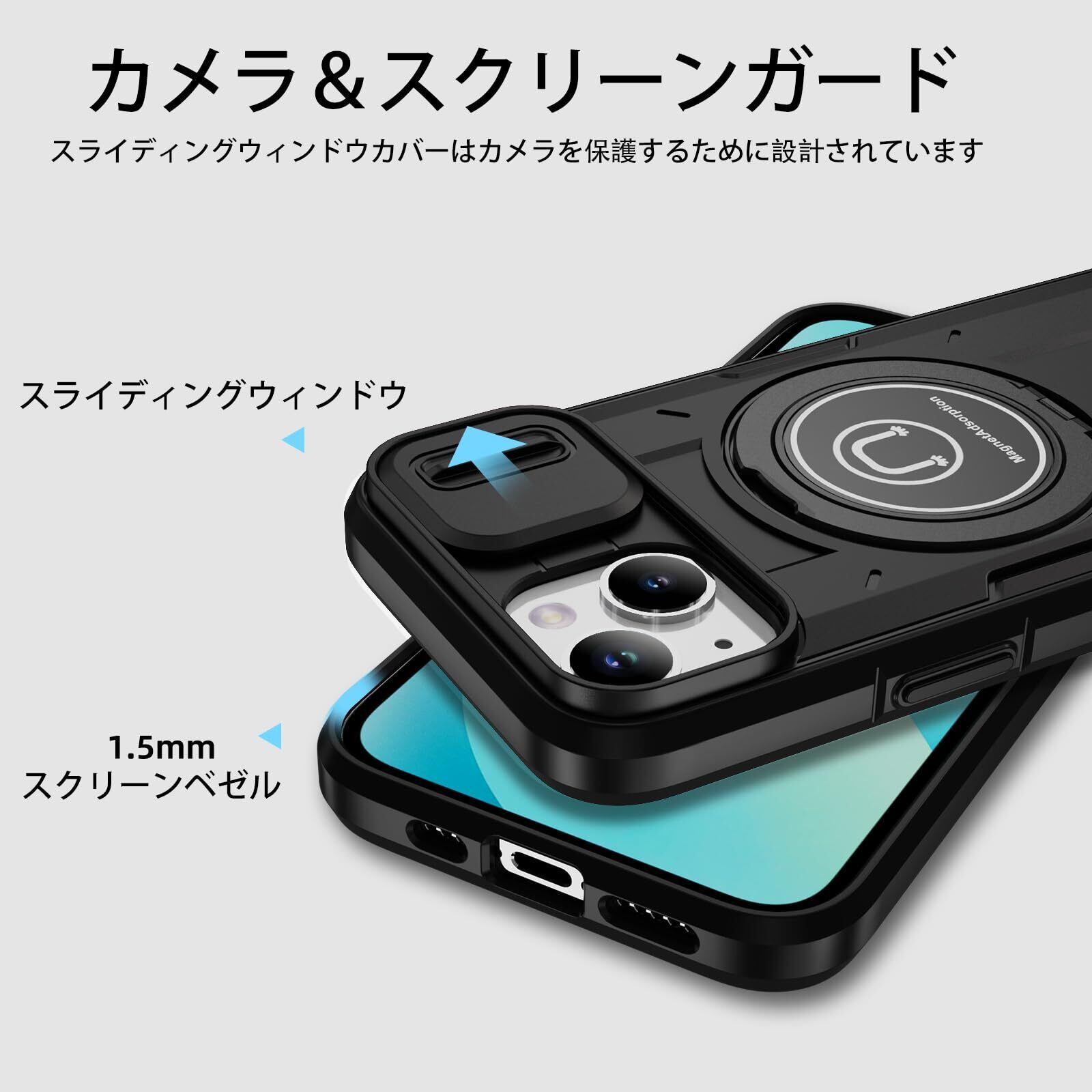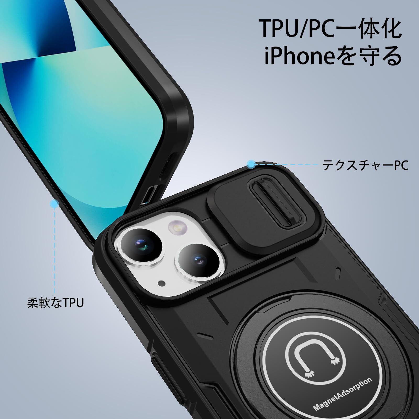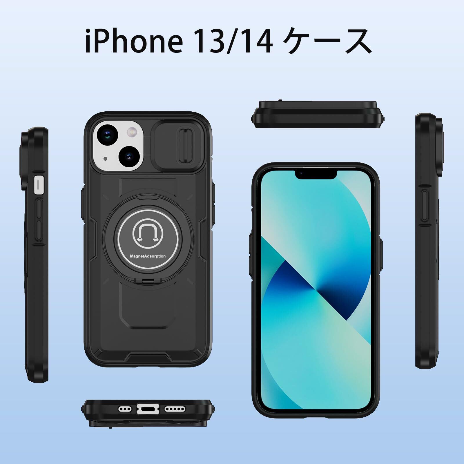 iPhone 13/14 ケース リング付き スタンド機能 耐衝撃 スライドカメラカバー レンズ保護 滑り止め 落下防止 車載ホルダー対応 アイホン14ケース アイフォン14 カバー ブラック 黑