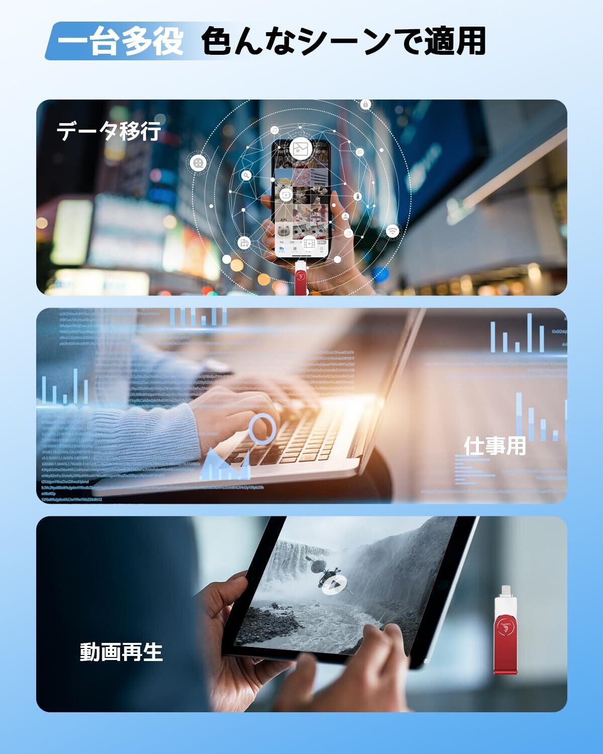 【容量不足解消・日本語取扱説明書付】スマホやPadなどに保存される写真や動画が増えているため、容量はいっぱいになって、iCloudストレージも上限に達し、スマホはフリーズしやすくなって、今は128GBのiPhone対応USBメモリーを使用すると、スマホの写真、動画などのデータを削除せずにUSBメモリに移行できて、スマホの容量を軽くすることができます。本製品には日本語取扱説明書が付属しており、USBメモリ中にも日本語取扱説明書のPDFファイルがあるので、シンプルで操作が分かりやすいです。