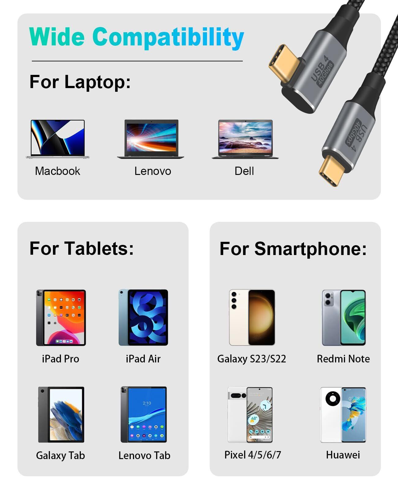 【L字型USB C コネクター設計】USB4ケーブル(Type-c -Type-c)の一端は直角端子で、コンセントやパソコンに繋いでも、ケーブルを無理やりに曲げる必要がなしで、スマホを横向きにして充電したり、ゲームしたり、スタンドやカバンに置いても便利になります。