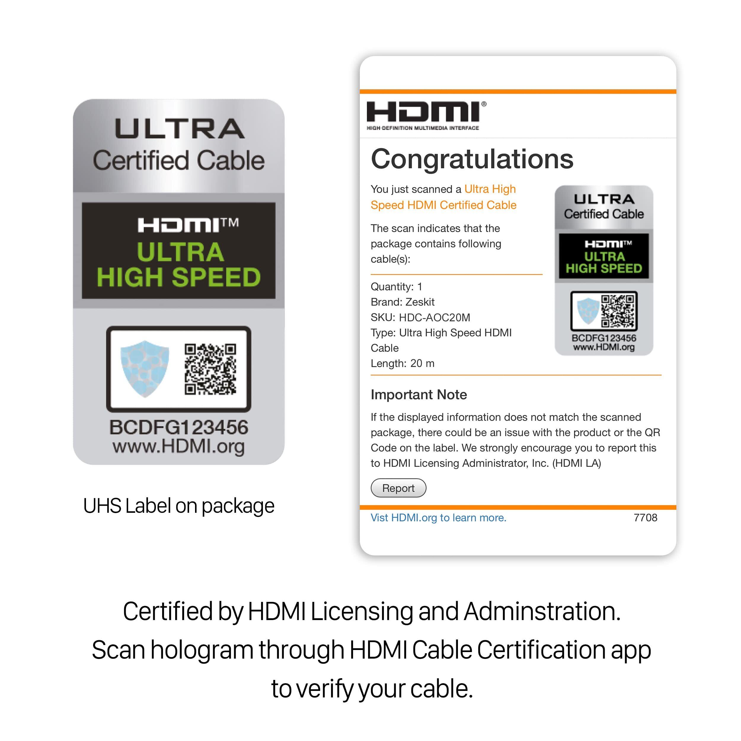 Zeskit 2.1 8K光ファイバー HDMIケーブル ウルトラハイスピード 20m【Ultra High Speed HDMI Cable認証品】4K120Hz 48Gbps 超高速 eARC Soundbar Ethernet Gaming 144Hz HDR VRR HDCP 2.2 2.3 Dolby Vision Atmos Apple TV Xbox SeriesX PS5対応