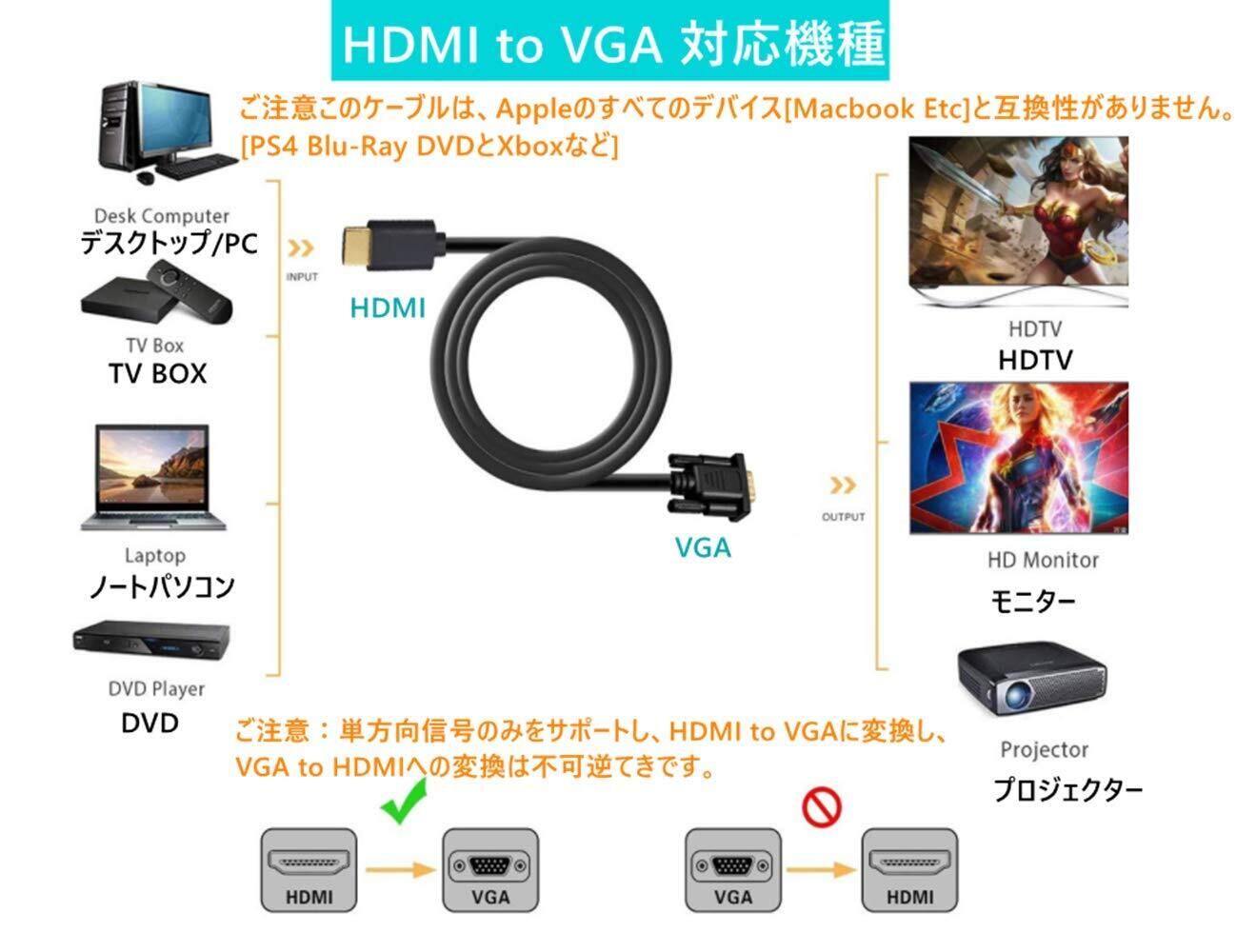 HDMI-VGA 変換ケーブル 1.8m:このケーブルはHDMIからVGAへの変換ケーブルです。パーソナルコンピューターHDMIから、簡単にプロジェクター、ディスプレイ、LCD、テレビ&モニタ、VGA端子につなぎと接続して映像、番組なのをVGA対応の大画面のTVに映し出せます。VGAからHDMIまではだめです双方転送に対応しておりません。「※ご注意:HDMI入力→VGA出力:、VGA入力→HDMI出力:✘」