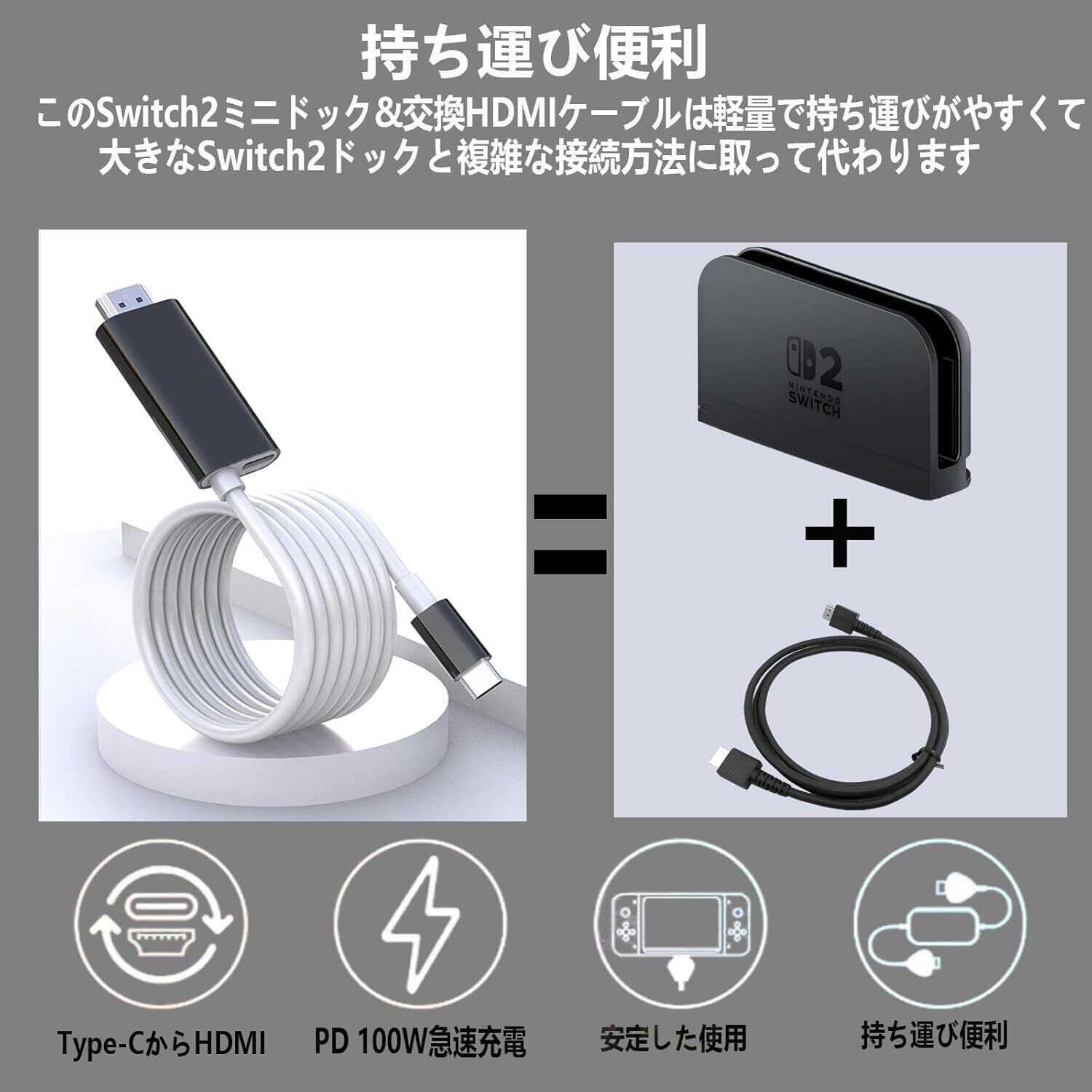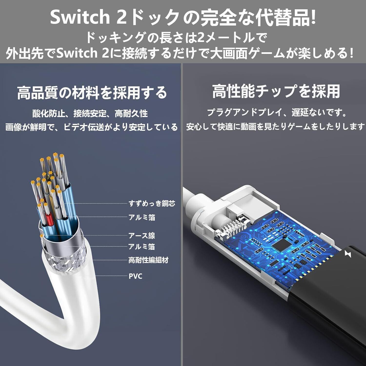 Switch 2 ドック 純正直接に TV 出力 Hdmi Type-C スイッチ 4K&1080解像度/HDMI変換/ PD100w充電/直接にTV出力多機能 アダプター小型 遅延なし Switch 2/Switch OLED/スイッチ/ノートパソコン/タブレット/スマートフォンなどに対応 旅行 出張 持ち運び便利(2M)