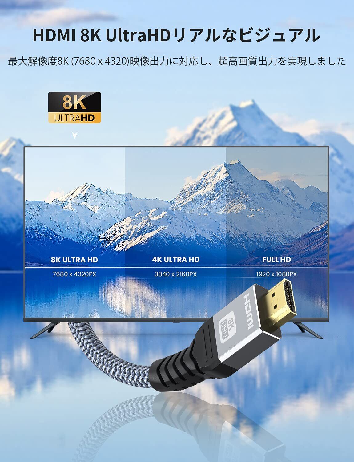 HDMI2.1規格:最新の8K HDMI 2.1規格:2.1規格HDMIケーブルより高い解像度・より速いリフレッシュレートを備えて、最大48Gbps帯域幅を対応し、8K@60Hz 8K@50Hz, 4K@120Hz, 4K@100Hz、UHD、FHD、3D、イーサネット、オーディオリターンチャンネル、HDR 4:4カラーフォーマット、48ビット/px 色深度をサポート。 HDMI 2.0b/2.0a/2.0/1.4/1.3/1.2/1.1との下位互換性があります